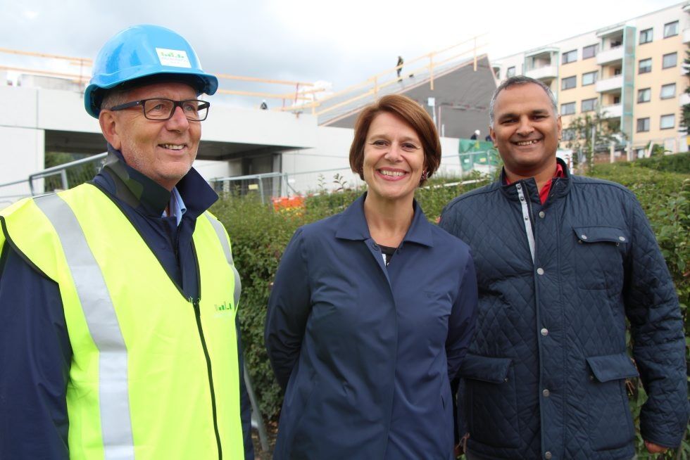 NYE FOSSUM BARNEHAGE: Byråd Tone Tellevik Dahl (Ap) møtte BU-leder Rashid Nawaz utenfor Fossum barnehage, sammen med fagansvarlig for bygg i Omsorgsbygg, Per Korneliussen. Barnehagen på Stovner skal ha plass til 180 barn. Dekningsprosenten i bydelen er på 65 prosent. Foto:Bilde 1 av 2