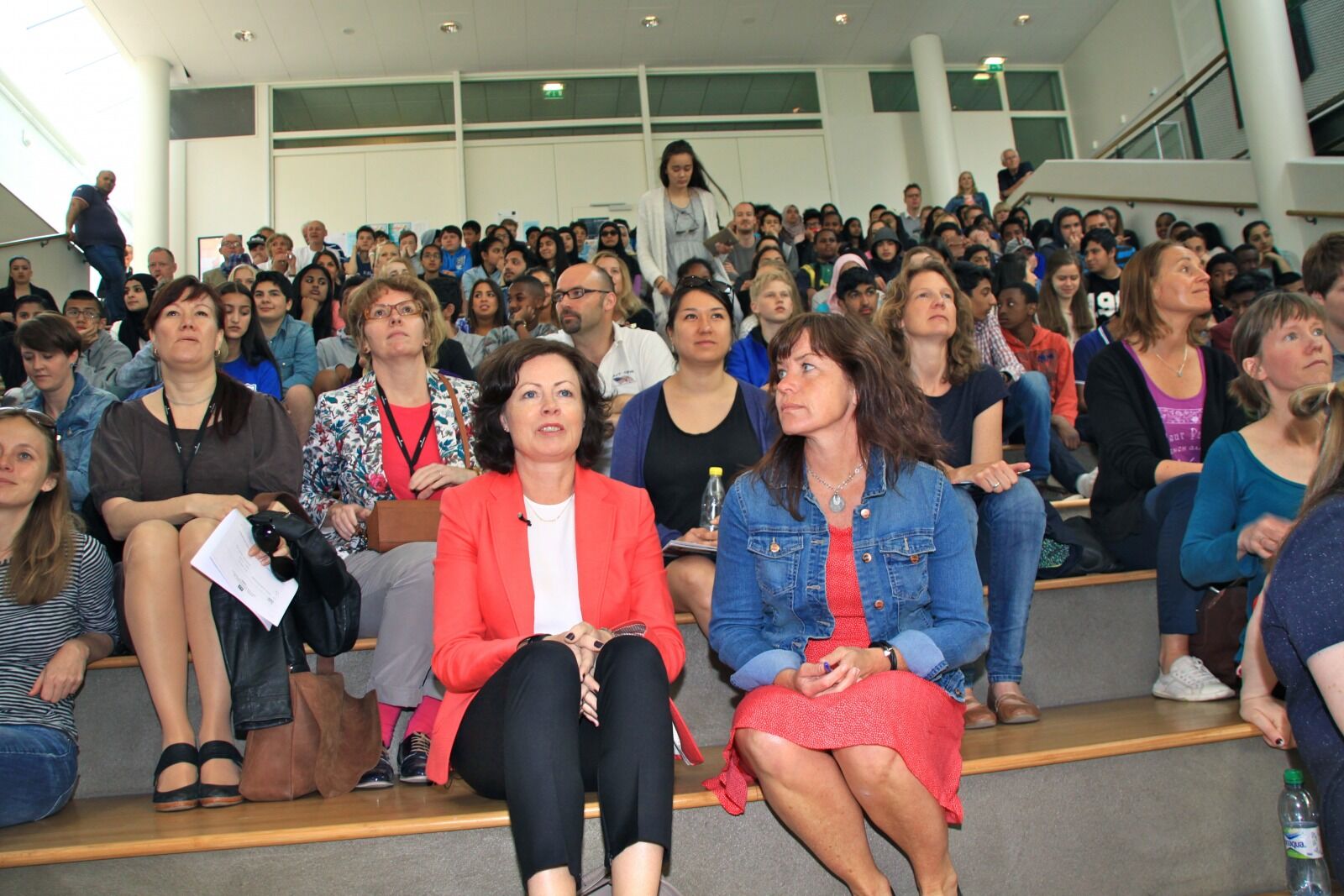 LITT NERVØS: Barne- og likestillingsminister Solveig Horne (Frp, foran f.v.) måtte svare på spørsmål fra Lindeberg-elever. Her sitter hun ved siden av Janne Raanes som er leder av Norgesprogrammet i Redd Barna. Foto:Bilde 1 av 2