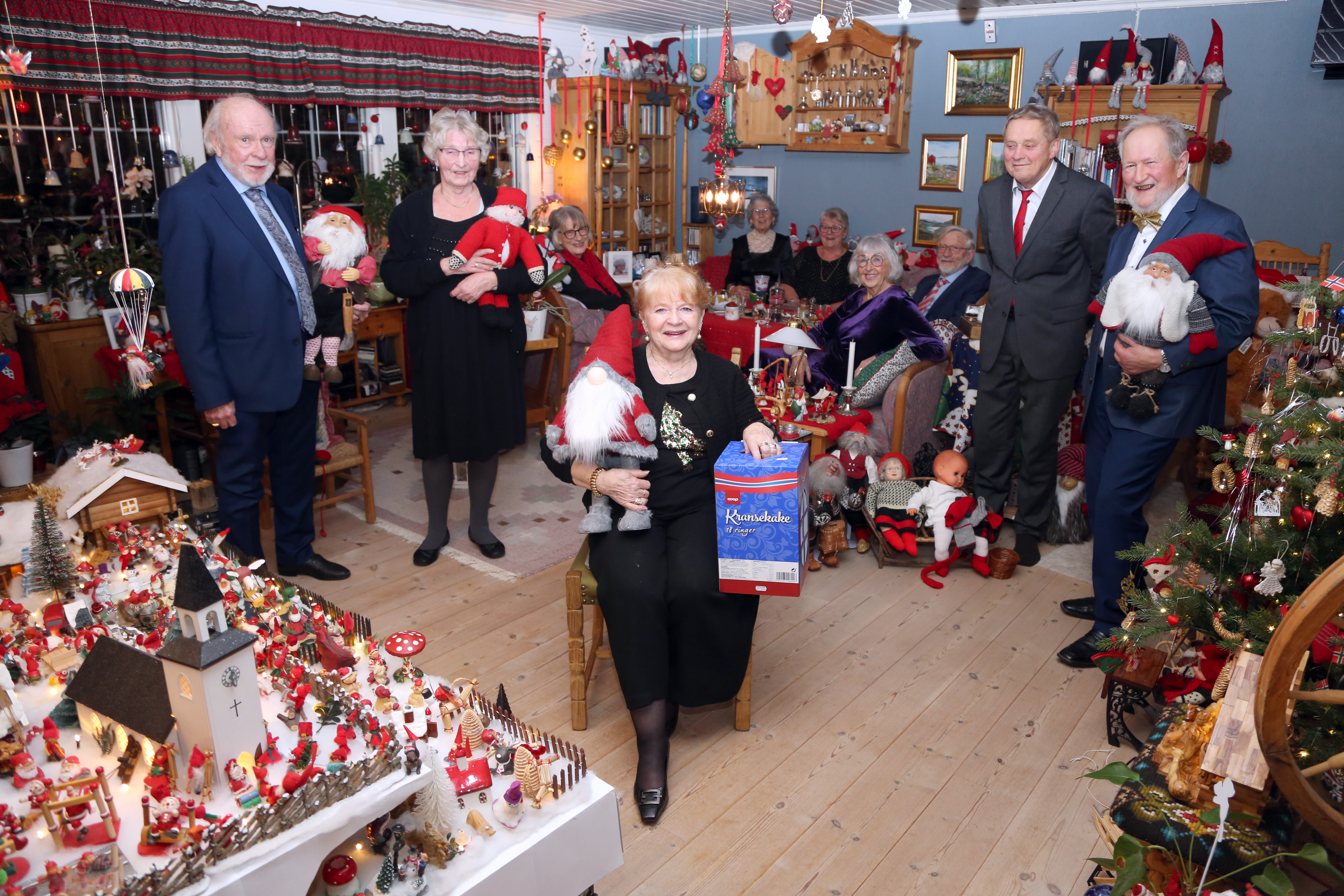 BLANT NISSENE: Når det skal fotograferes i stua til Frøydis og Gunnar på nyttårsaften, bringes festdeltakerne selvfølgelig inn i nisseland. Vidar Cederkvist (f. v.), Grete Paulsen, Trina Rudi, Lut Sercu, Evy Gahrmaker, Guttorm Rudi, Laila Tjemsland, Bjørn Erik Paulsen og Gunnar Stenerud. Frøydis Cederkvist Stenerud sittende i forkant. FOTO: Rolf E. Wulff