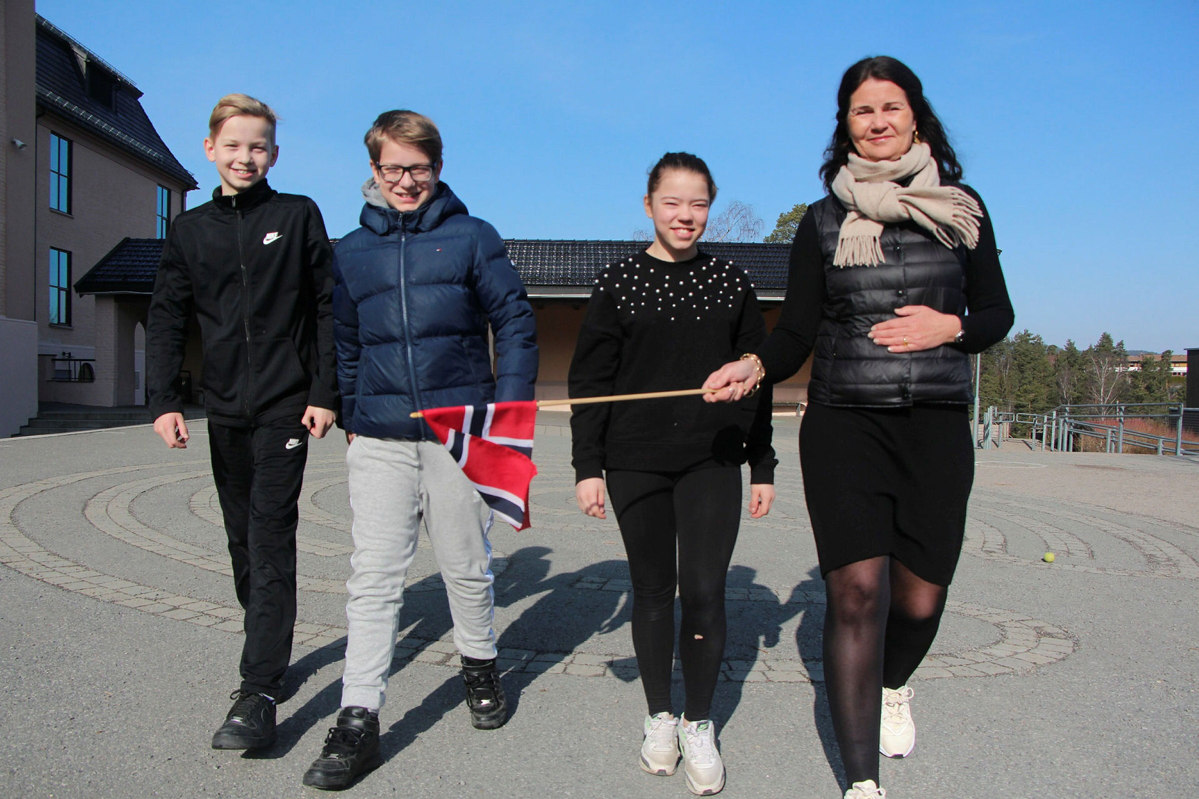 HØYBRÅTEN STRÅLER: Høybråten skole går først i årets barnetog i sentrum. Her med Michael Bragmo Inderlid (f.v), Jesper Grimsrud Falla, Maud Alette Christiansdatter Bratsberg-Siri og rektor Ricke Müller. Foto:Bilde 1 av 1