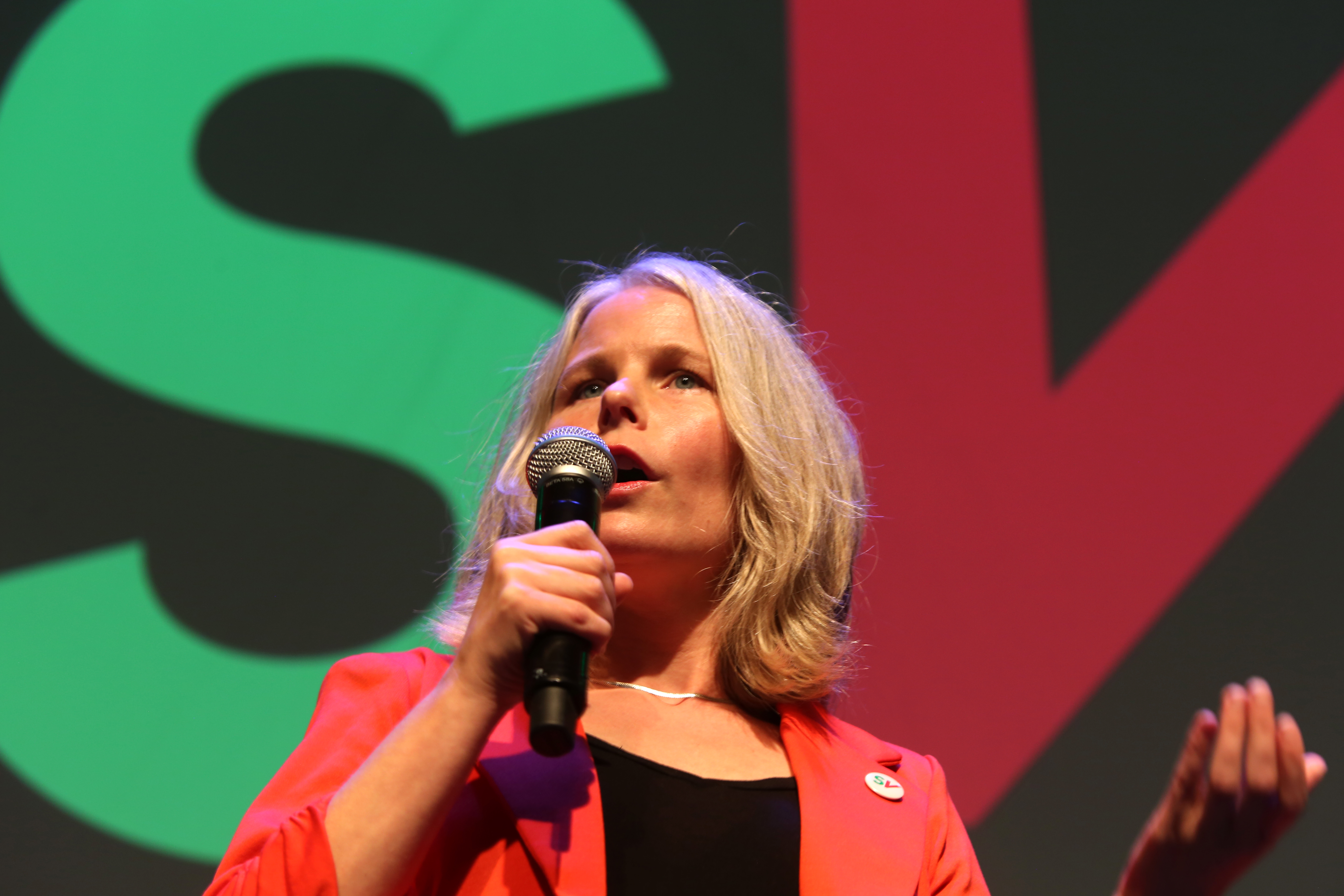– Partiene rundt oss går tilbake. Men når Høyre-vinden blåser som verst, da står vi støtt. Vi står bergstøtt!, sa partileder Kirsti Bergstø på SVs valgvake på Rockefeller.