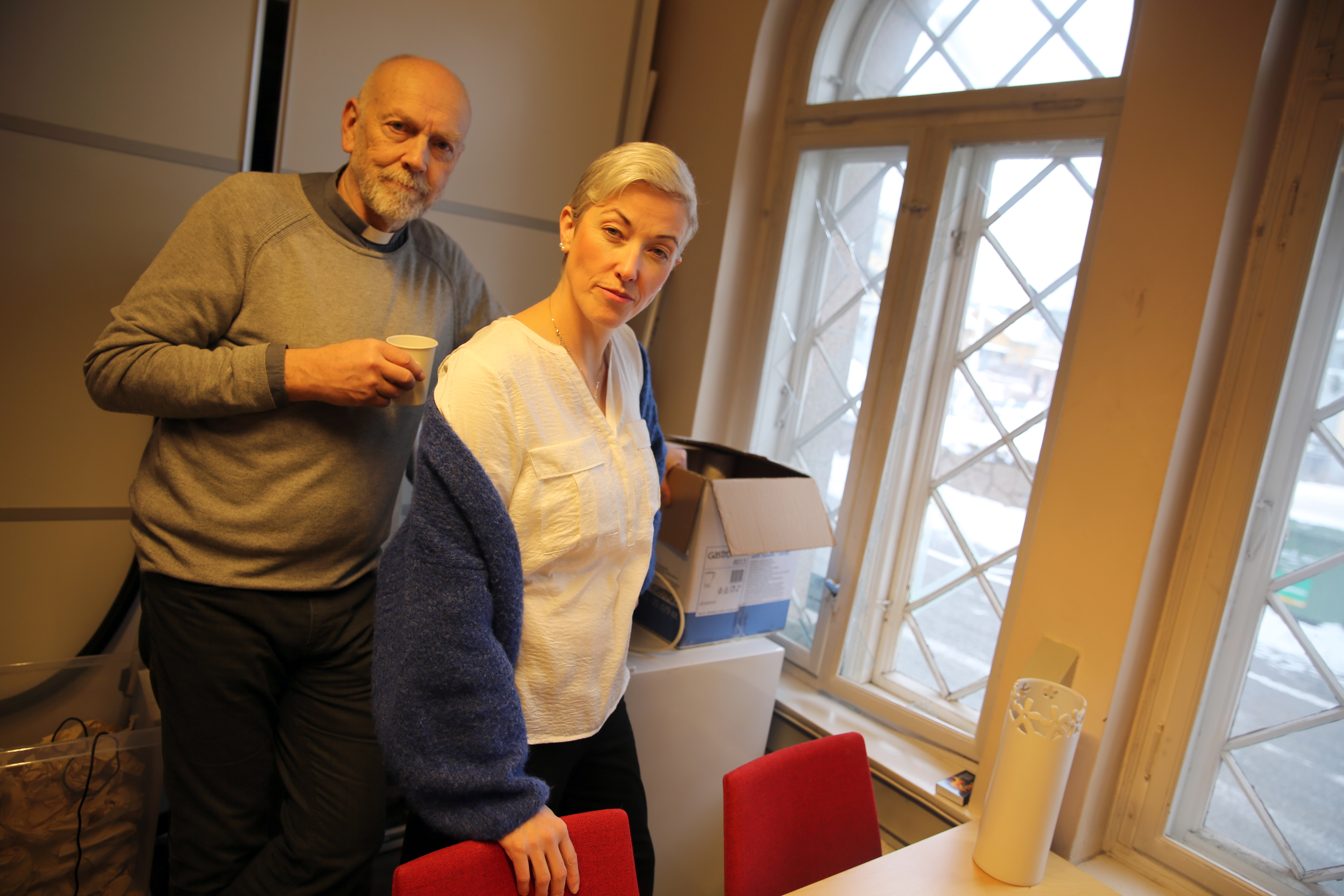 GEISTLIG BEKYMRING: Sokneprest Tor Øystein Vaaland og menighetsrådsleder Tone Borgen i Grorud menighet, konstaterer at vinduet som noen knuste i kjøkkensakristiet har blitt sikret av politiet. Selv om ikke noe er stjålet fra kirken fordi det simpelthen ikke er noe av verdi å stjele der, misliker de sterkt at noen har klart å bryte seg inn i kirken to ganger i løpet av kort tid. Bilde 1 av 1