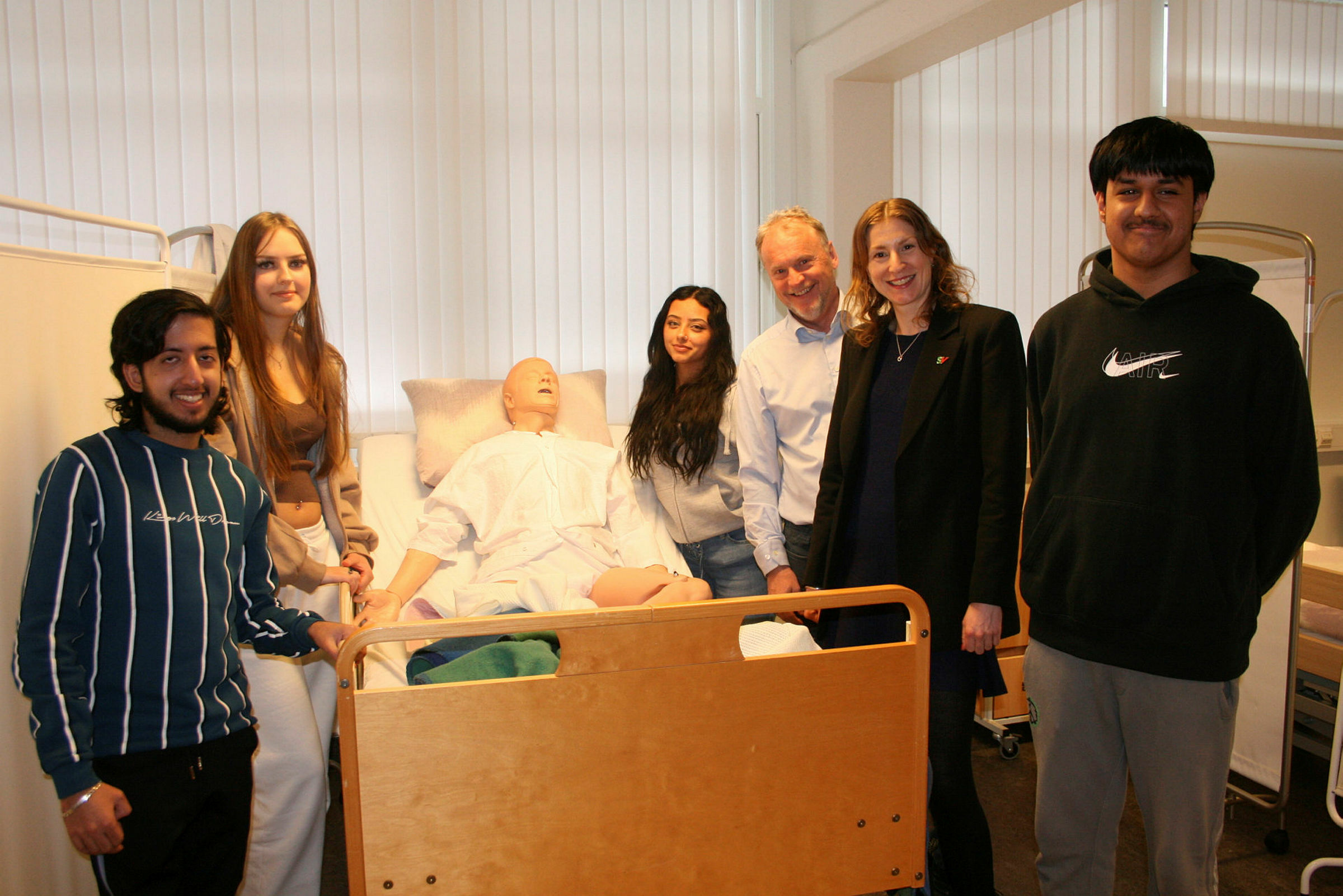 STYRKER HELSEFAG: Ali Akbar Khan (f.v.), Julie Kristine Rønning, Sereen Hamra, byrådsleder Raymond Johansen (Ap), skolebyråd Sunniva Holmås Eidsvoll (SV) og Danish Iqbal håper at flere vil velge helsefag dersom de vet hva det handler om, og det blir lettere å få læreplass etter andre klasse. Foto: Caroline HammerBilde 1 av 1
