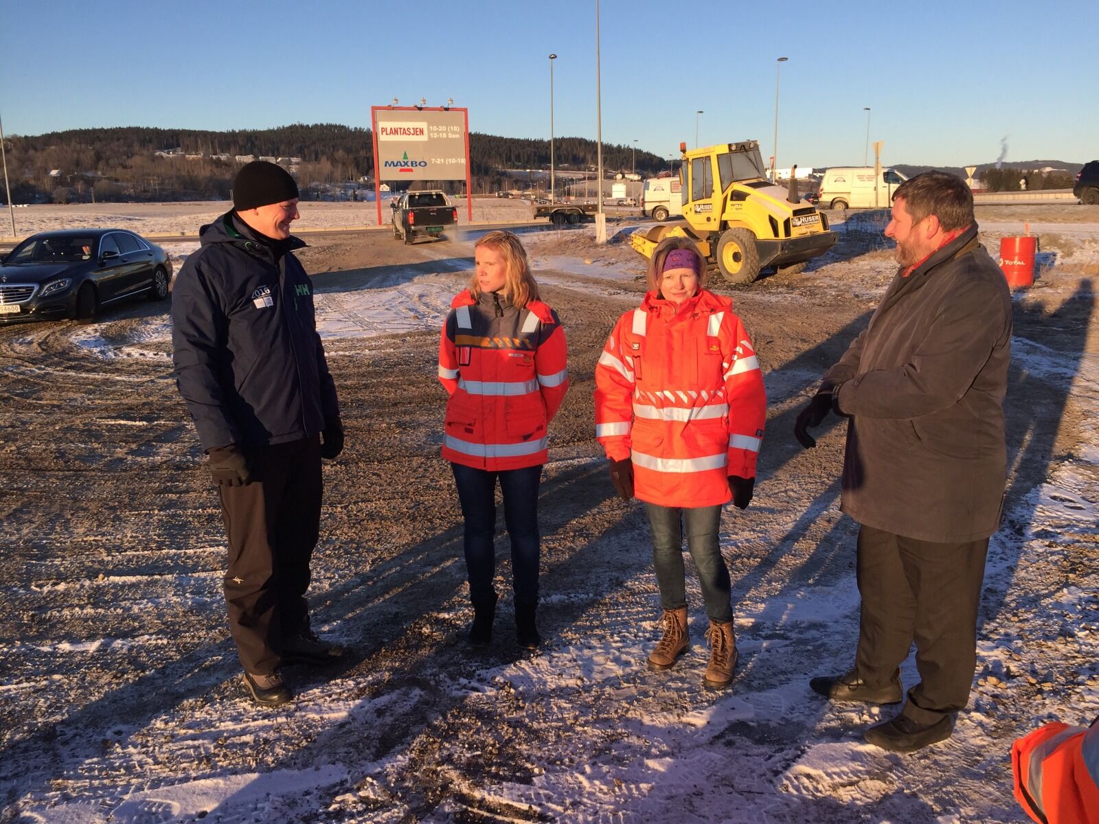 TUSEN PARKERINGSPLASSER: Innfartsparkeringen ved Plantasjen på Hvam er én av fire som nå etableres. Her er samferdselsministeren i samtale med Statens vegvesen og Ruter-sjef Bernt Reitan Jenssen. (Foto: Øystein Dahl Johansen/Ruter) Foto:Bilde 1 av 2