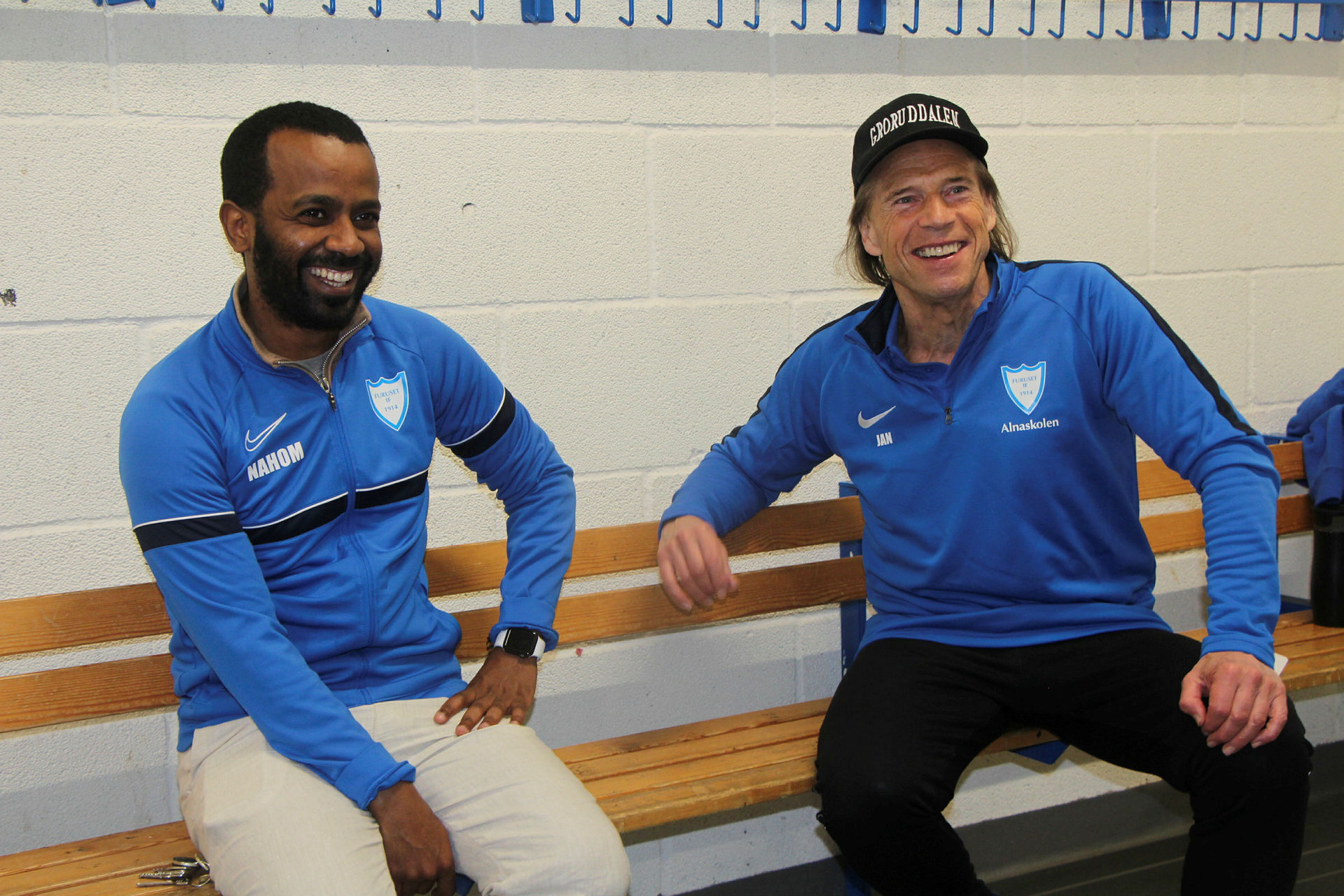FURUSET: Jan Bøhler har valgt å gi inntektene sine fra boka «Nær folk» til Furuset IF sin fotballgruppe. Her med Nahom Jonas. Foto: Sindre Veum ApnesethBilde 1 av 2