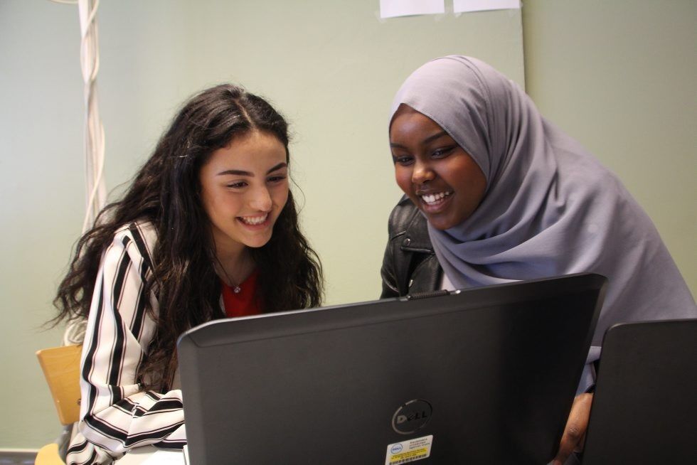 SISTE FINPUSS: Yasmina Hammani (t.v.) og Mona Hassan legger siste hånd på CV- og søknadsverket i jobbsenteret for ungdom på Blokk 58. Foto:Bilde 1 av 2
