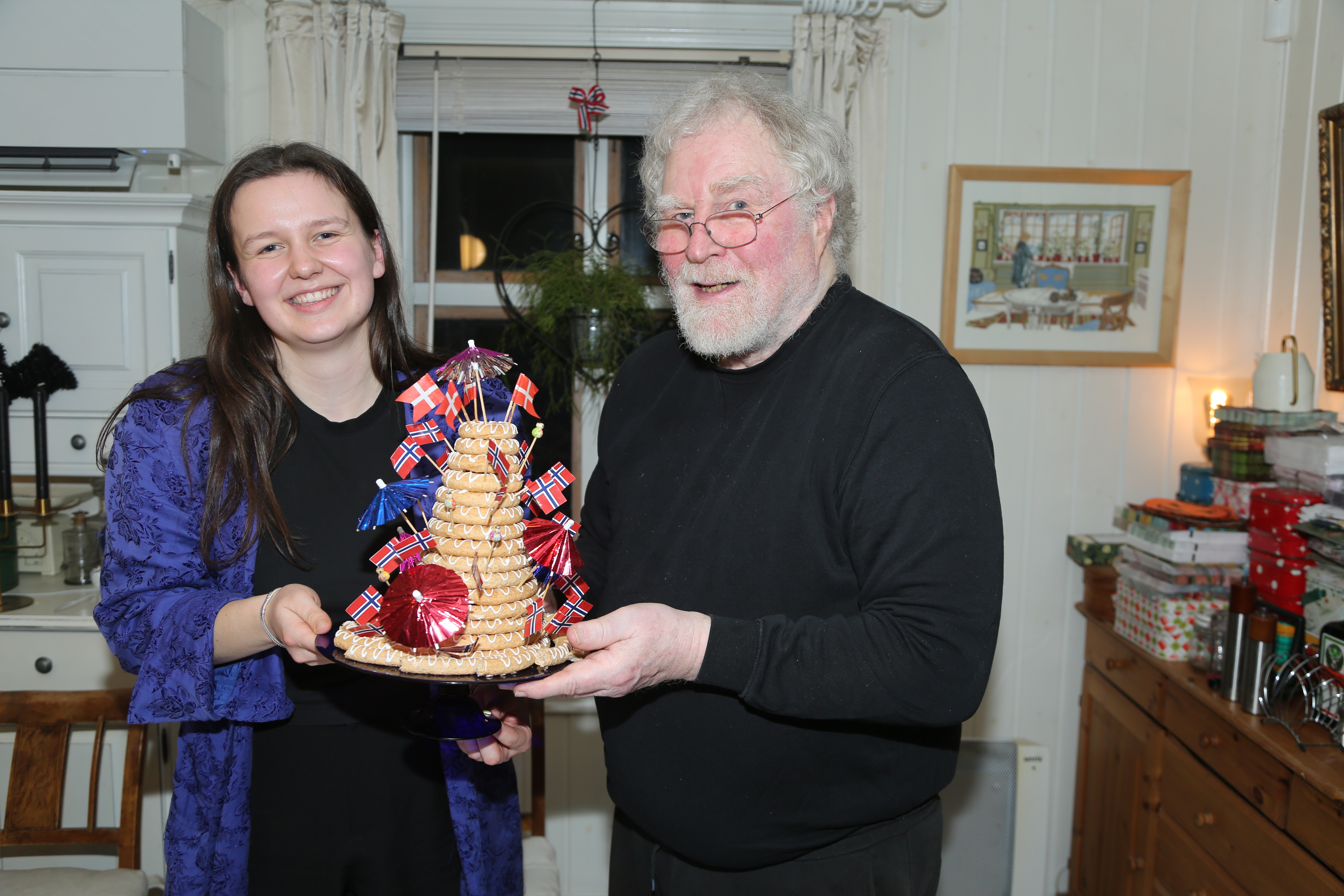 VELFORTJENT VINNER: Olivia Køppe Christoffersen er den første mottakeren av Skovlystipendet som komponist og professor emeritus ved Norges musikkhøyskole, Olav Anton Thommessen står bak. Siden Olivia er dansk måtte selvsagt kransekaka som var en del av desserten under prisutdelingsmiddagen også pyntes med danske flagg. FOTO: Rolf E. WulffBilde 1 av 4