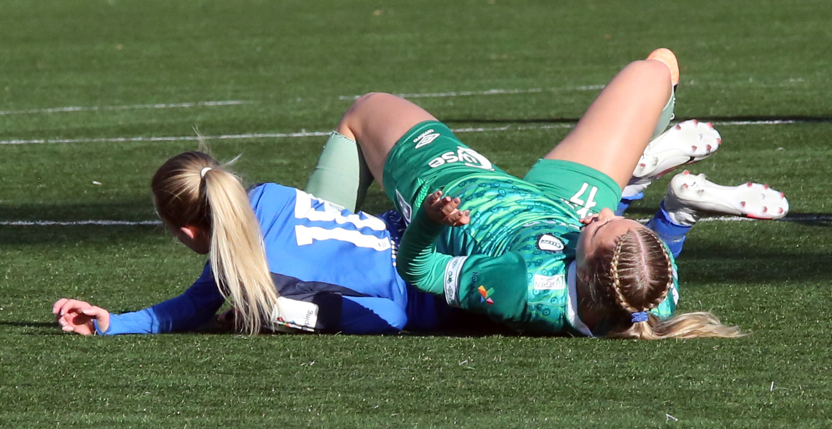 PÅ BUNN: Det spørs om ikke Grei og Klepp - her representert med Thea Mikkelsen og Ingrid Rame - med uavgjort i bunnoppgjøret sørget for at begge lag rykker ned etter sesongslutt. FOTO: Rolf E. WulffBilde 1 av 22