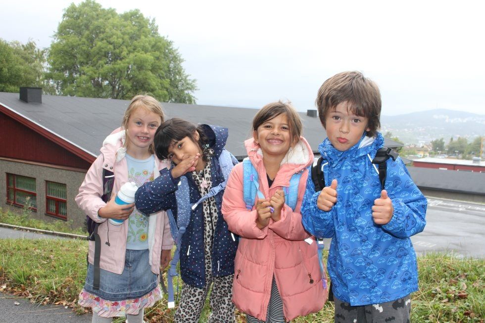 Åsne Marie Førstøyl-Kristiansen (6), Laiba Afroge (6), Leonardo Gerrald Johannessen (6) og Celine Marie Habboub (6) skal alle begynne i førsteklasse på Skjønnhaug på mandag. Samtlige er fra Lindeberg-området, og alle har brukt den siste uken av sommerferien på Skjønnhaug Aktivitetsskole (AKS) med venner og det som også blir deres nye klassekamerater.