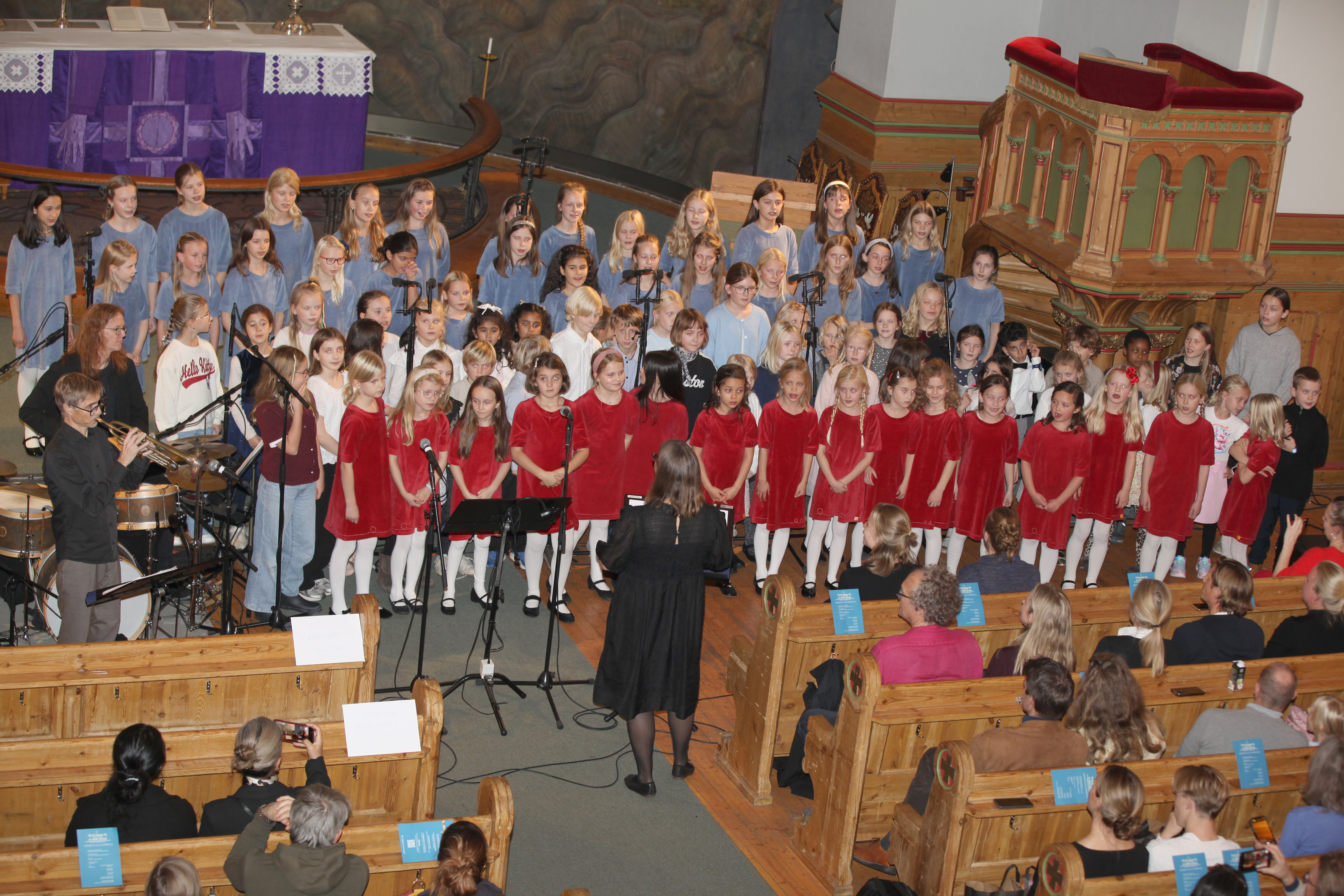 Det var nesten 100 barn som sto og sang for full hals foran alterringen i kirken.