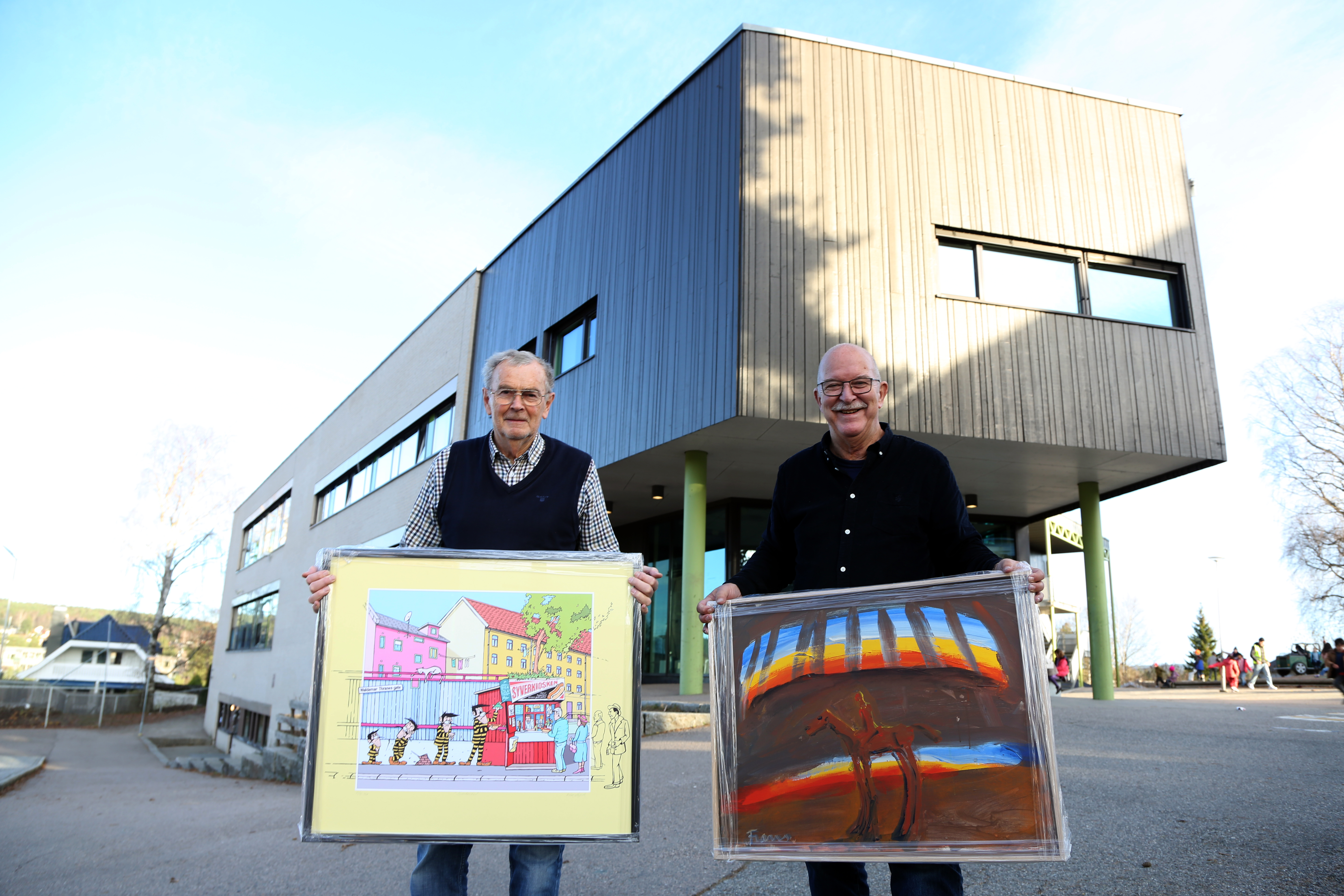STOR BREDDE: Høybråten Lions kan tilby det meste på sin årlige kunstutstilling på Høybråten skole. Kasserer Erik Nordahl (t v) viser fram et kunstverk av Magnus Schive som har tegnet et ganske så artig motiv av den legendariske Syverkiosken på Aleksander Kiellands plass, mens leder i kunstkomiteen, Per-Kristian Petersen, viser fram et av Frans Widerbergs meget ettertraktede kunstverk. Stor forskjell i både kunstform og pris. FOTO: Rolf E. Wulff