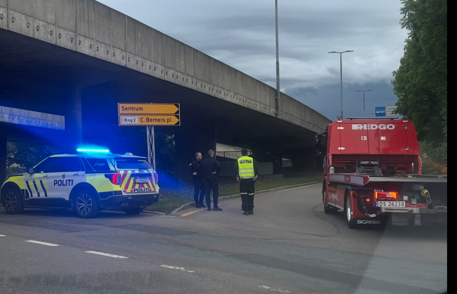 21.55: Brannen er slukket og bilen blir fjernet. Trafikken går straks som normalt.
