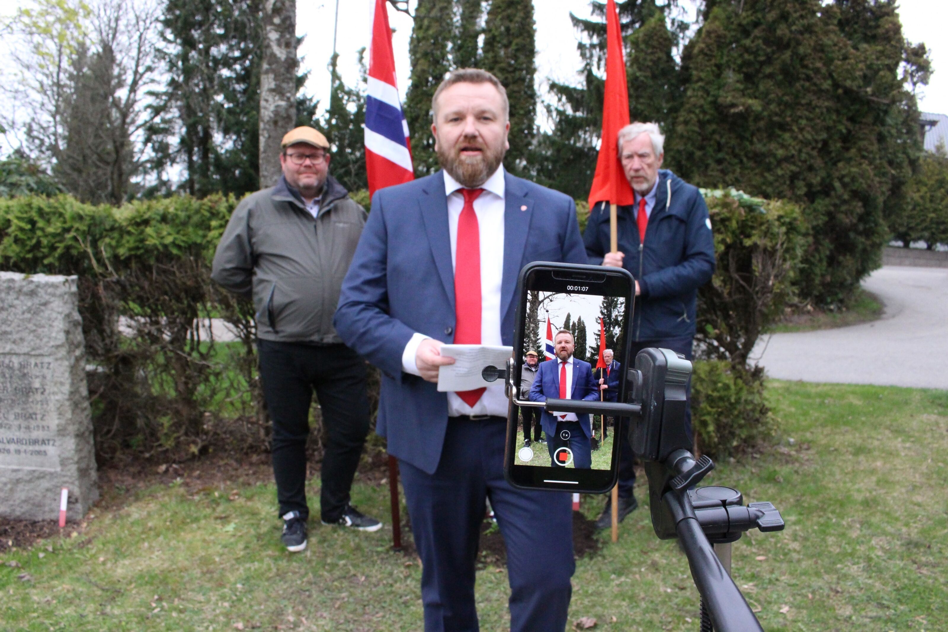 FILMER TALEN: Grorud Arbeiderparti, med leder Anders Ørnø Røberg-Larsen i spissen, møttes ved gravene til Trygve Lie og Thomas Margido Antonsen i går, torsdag 30. april, for å legge ned blomster og holde appeller. Markeringen deles på sosiale medier i dag, 1. mai. Selv holdt Anders Ørnø Røberg-Larsen tale ved Trygve Lies grav, mens partikollega Siri Fossheim talte ved graven til Thomas Margido Antonsen. Foto:Bilde 1 av 1