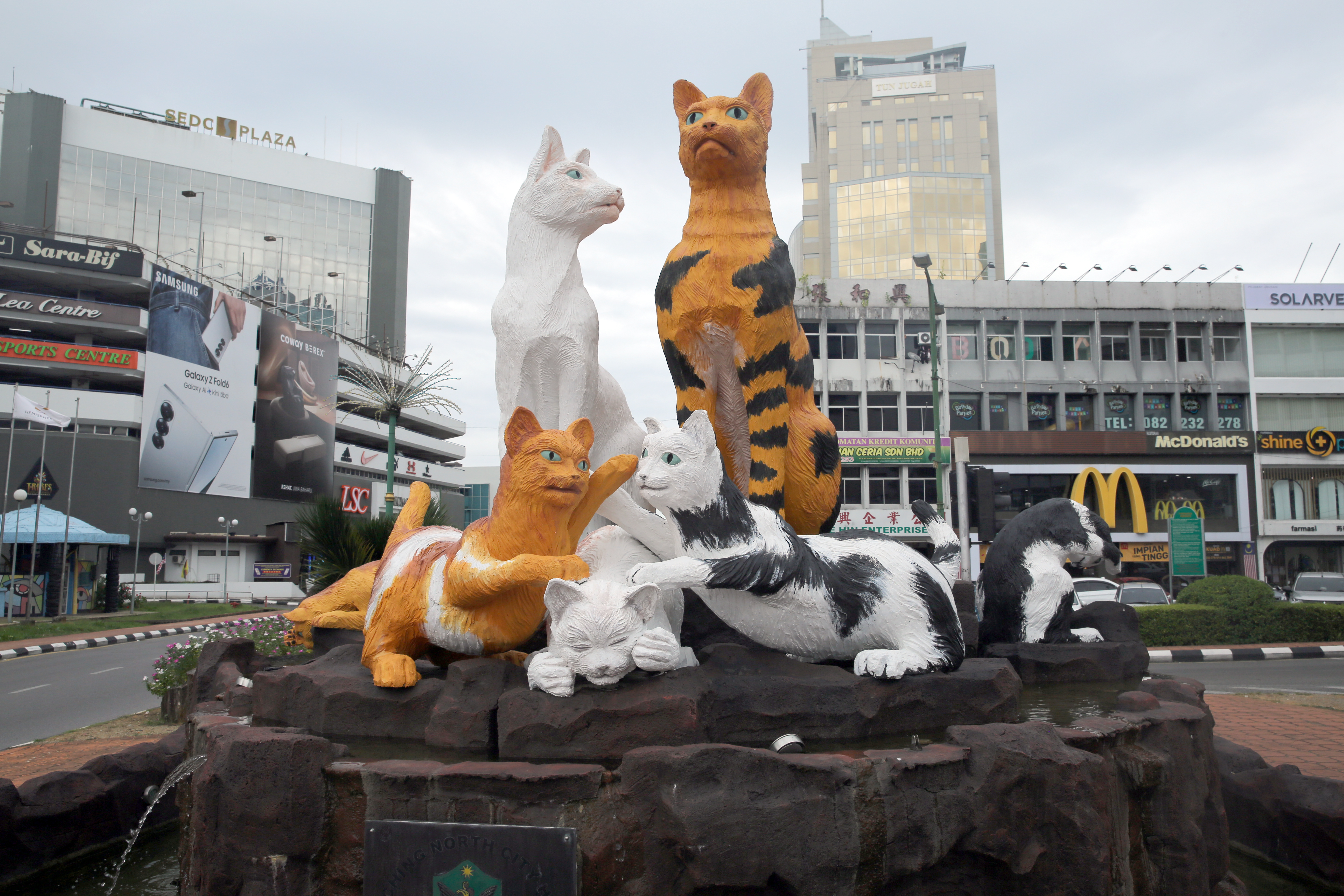 LETT SYNLIG: Ingen som besøker Kuching kan unngå å støte på denne kattefamilien. FOTO: Rolf E. Wulff