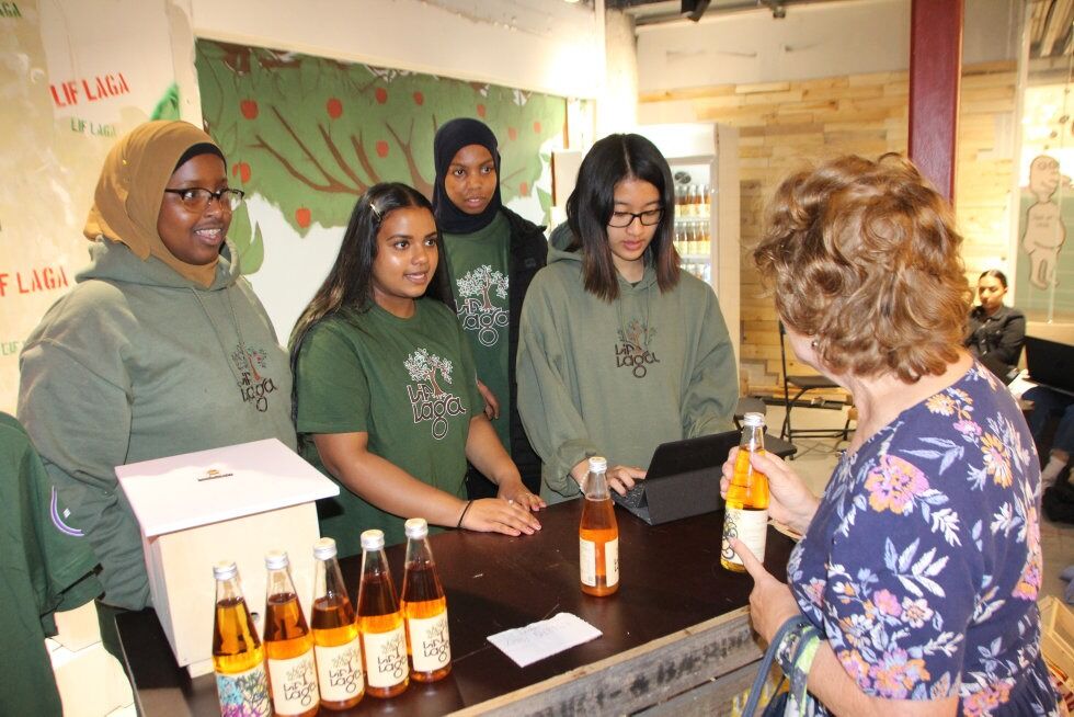 I «EPLEBUTIKKEN»: Nioma Yusuf (17), Sugirtha Baskaran (16), Hubi Osman Farah (17) og Trang Thuy Duong (16) er her fullt i gang med sine arbeidsoppgaver. Det tok heller i lang tid før en av sentrets kunder fikk øye på eplemosten. Foto:Bilde 1 av 2