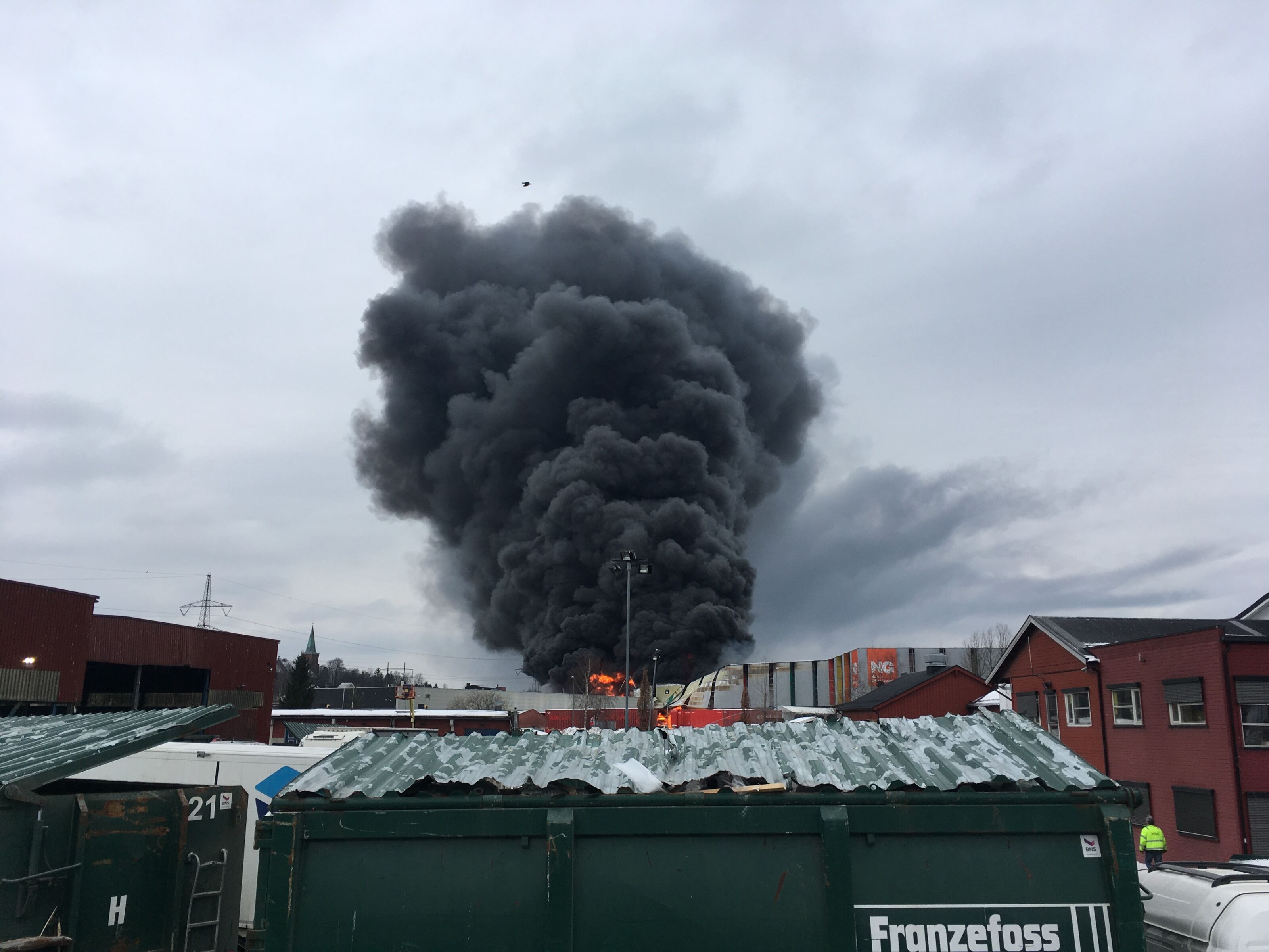 Det var circa klokka 09.40 at nødetatene fikk melding om brannen i en lagerbygning ved Norsk Gjenvinnings anlegg på Haraldrud. Bedriften ligger ikke langt fra Kuben videregående skole, ved de karakteristiske pipene til Renholdsetaten.