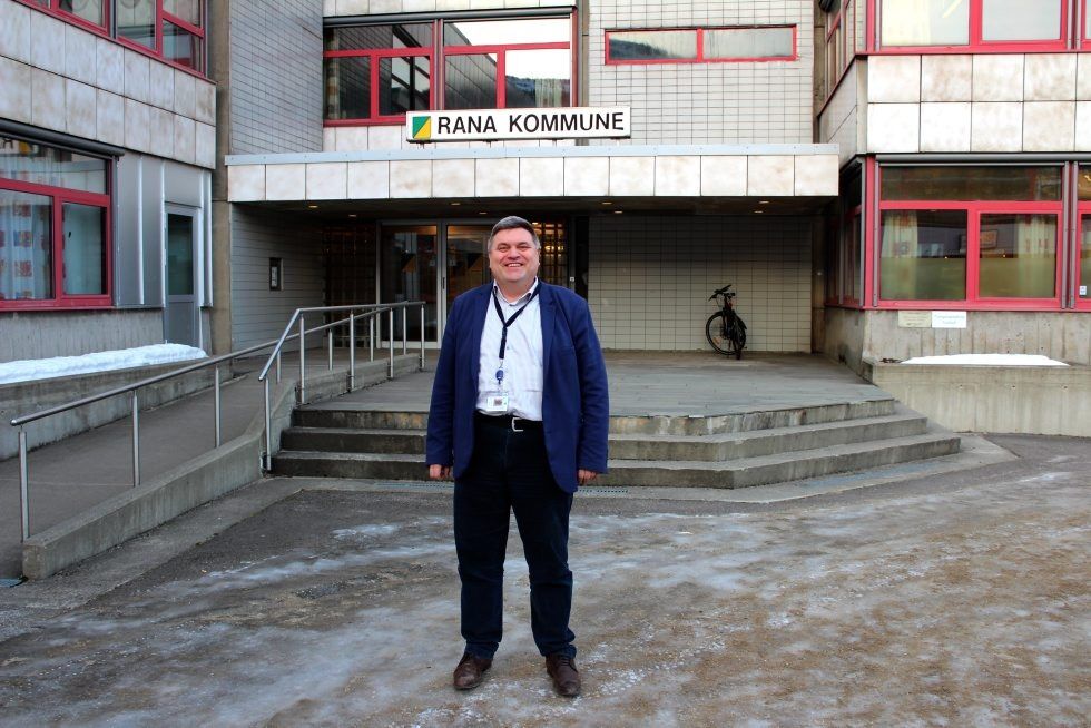 PÅ FREMMED GRUNN: Geir Staib har søkt seg til nye utfordringer på en helt annen kant av landet - i Rana kommune. Her foran rådhuset. Foto:Bilde 1 av 1