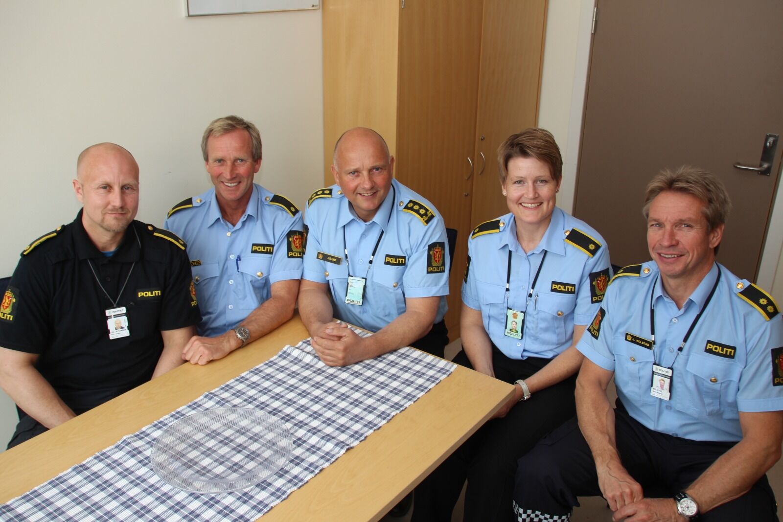 LOVER BEDRE OPPFØLGING: Førstebetjentene Tom André Christiansen (t.v.) og Roy Cato Einarsen, stasjonssjef John Roger Lund, førstebetjent Lone Strand og overbetjent Jarle Kolstad har ansvar for det nye trygghetsprogrammet som skal sikre ofre bedre oppfølging. Foto:Bilde 1 av 2