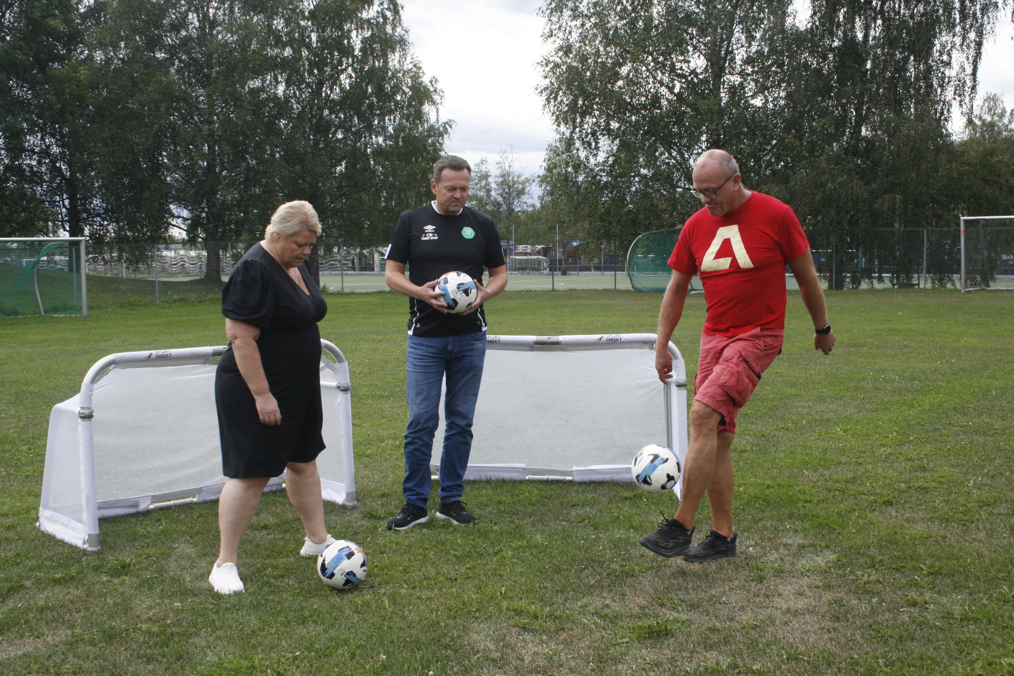 ALLE SKAL FÅ LEKE: Utstyr til idrett, som ballene og fotballmål til treer-bane, er noe av det som dekkes av momskompensasjonen. Arbeiderpartiet lover at den skal bli som den er i dag. Her med Marthe Scharning Lund (Ap, f.v.) Espen Myrbakken i Stovner SK og Frode Jacobsen (Ap).Bilde 1 av 2