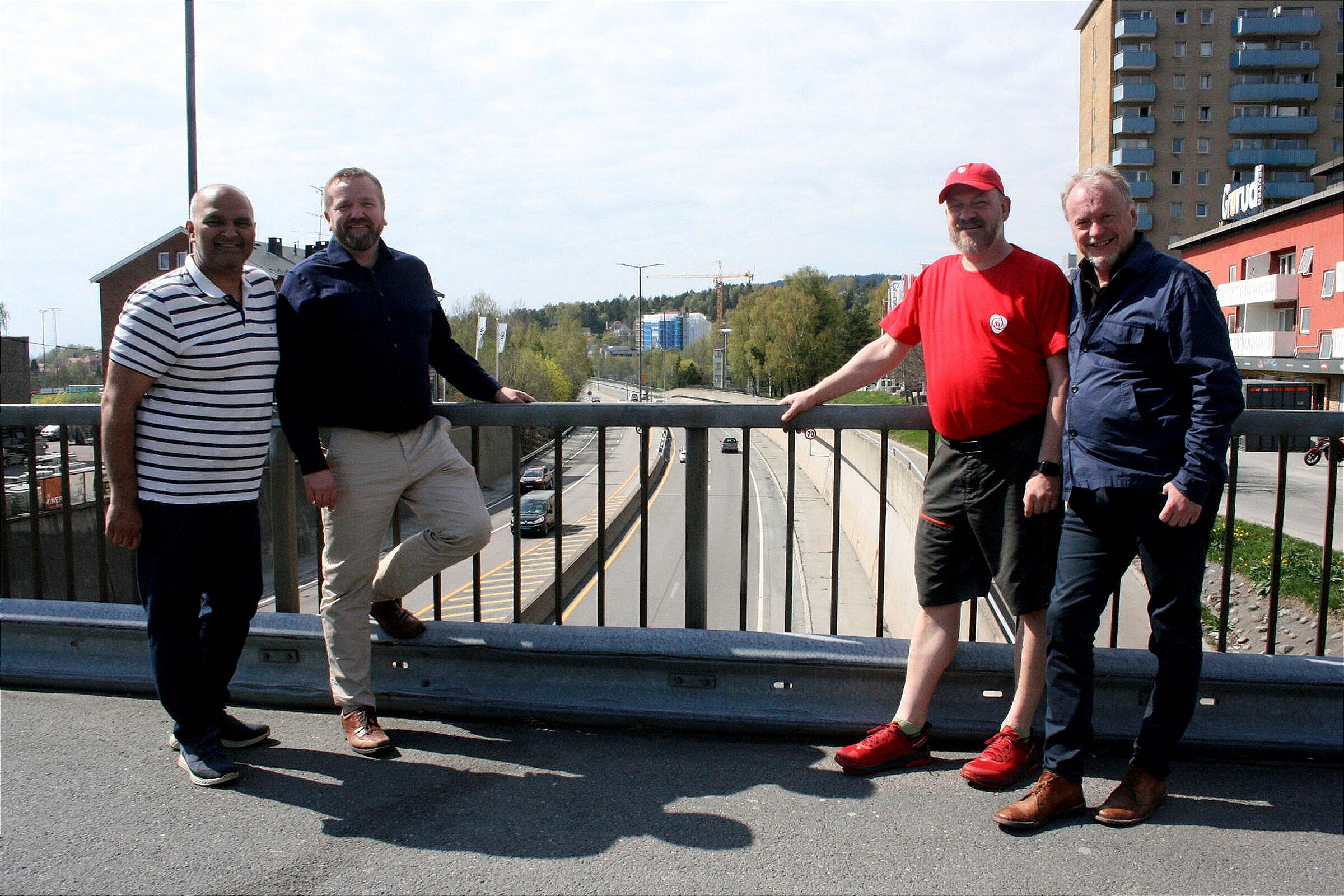 TRAFIKKEN SKAL NED: I dag er store deler av Trondheimsveien firefeltsvei og minner mer om en motorvei. Rashid Nawaz (Ap, f.v.), Anders Røberg-Larsen (Ap), Lars Erik Fuglesang (Ap) og byrådsleder Raymond Johansen (Ap) har tro på at det snart er et løst problem og lover at Trondheimsveien skal inn i Oslopakke 3. Foto: Caroline HammerBilde 1 av 1