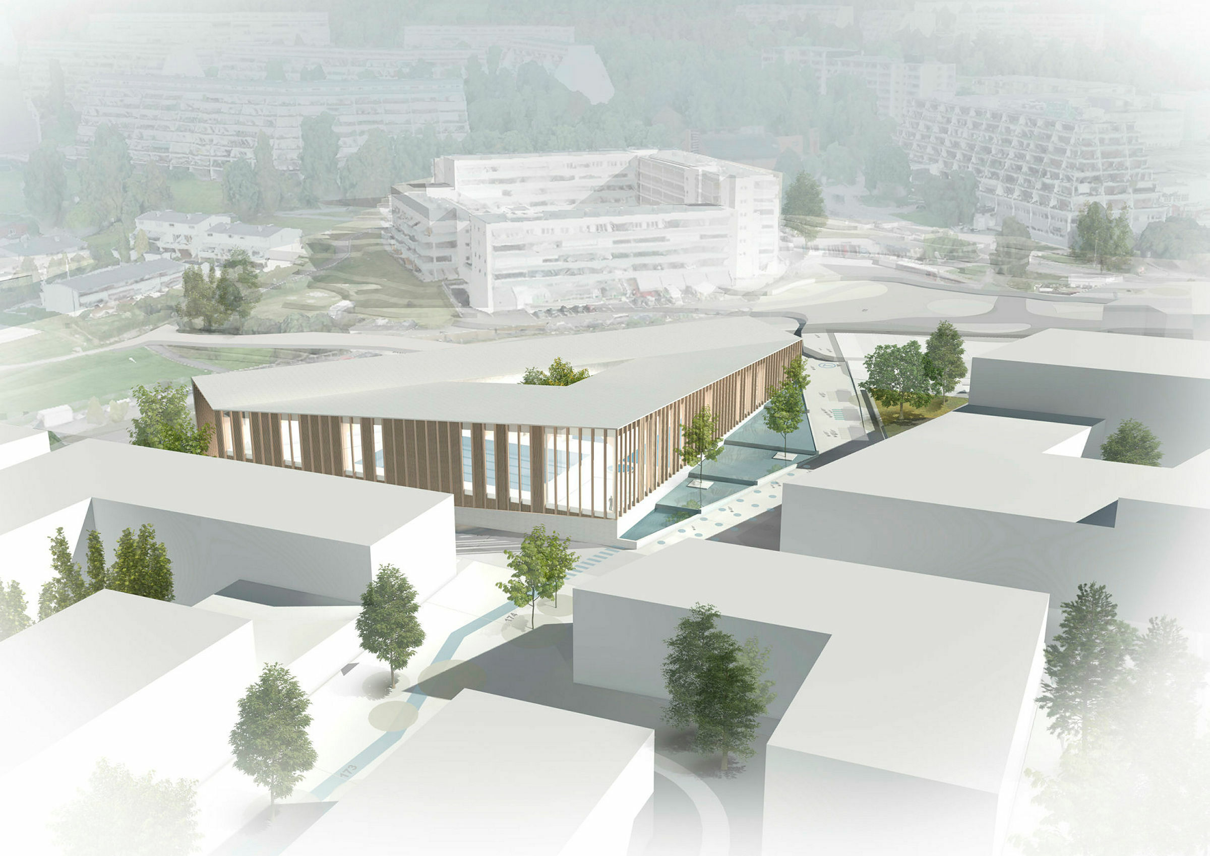 FUGLEPERSPEKTIV: Stovner Bad ble endelig vedtatt før påske, men nå kom nyheten om budsjettsprekk. (Illustrasjon:Dyrø og Moen Arkitekter.) Foto: Dyrø og Moen ArkitekterBilde 1 av 1