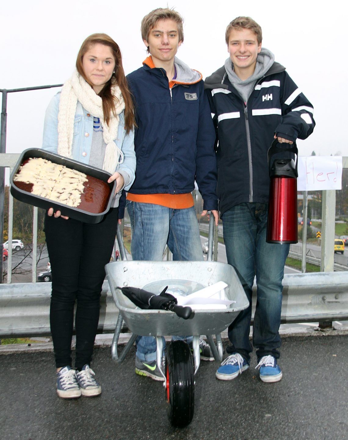 Birk (15), Mats (15) og Bettina (15) måtte bruke trillebår for å frakte vafler fra Årvoll til Linderud.