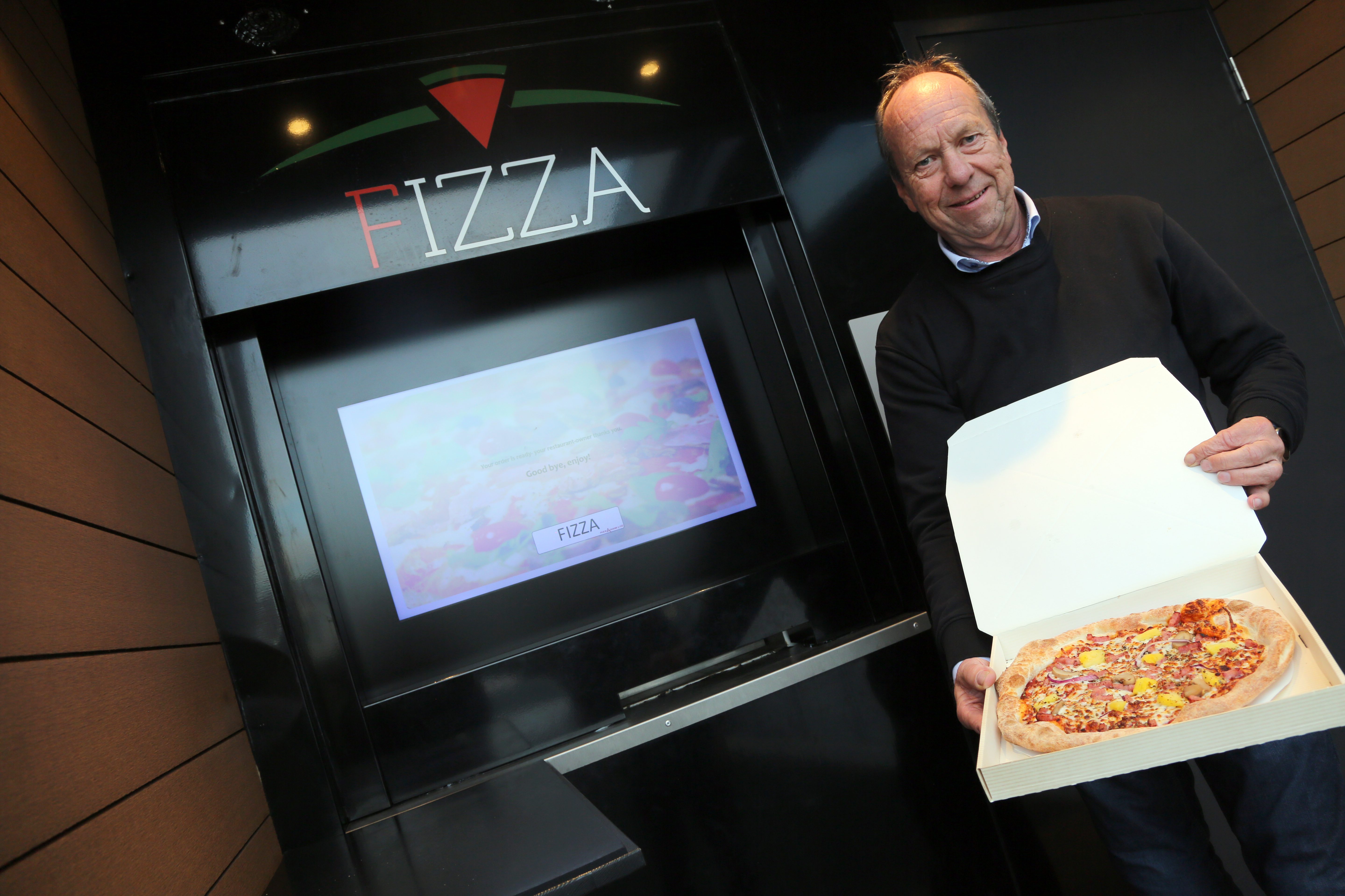 – Ja, i stedet for at det kommer ut sedler fra den åpningen der er det en boks med ferdig bakt/stekt pizza du får i hendene. Du kan også få den halvstekt hvis du ønsker å varme opp pizzaen selv hjemme. Den kan holde seg i to dager før du varmer den opp.