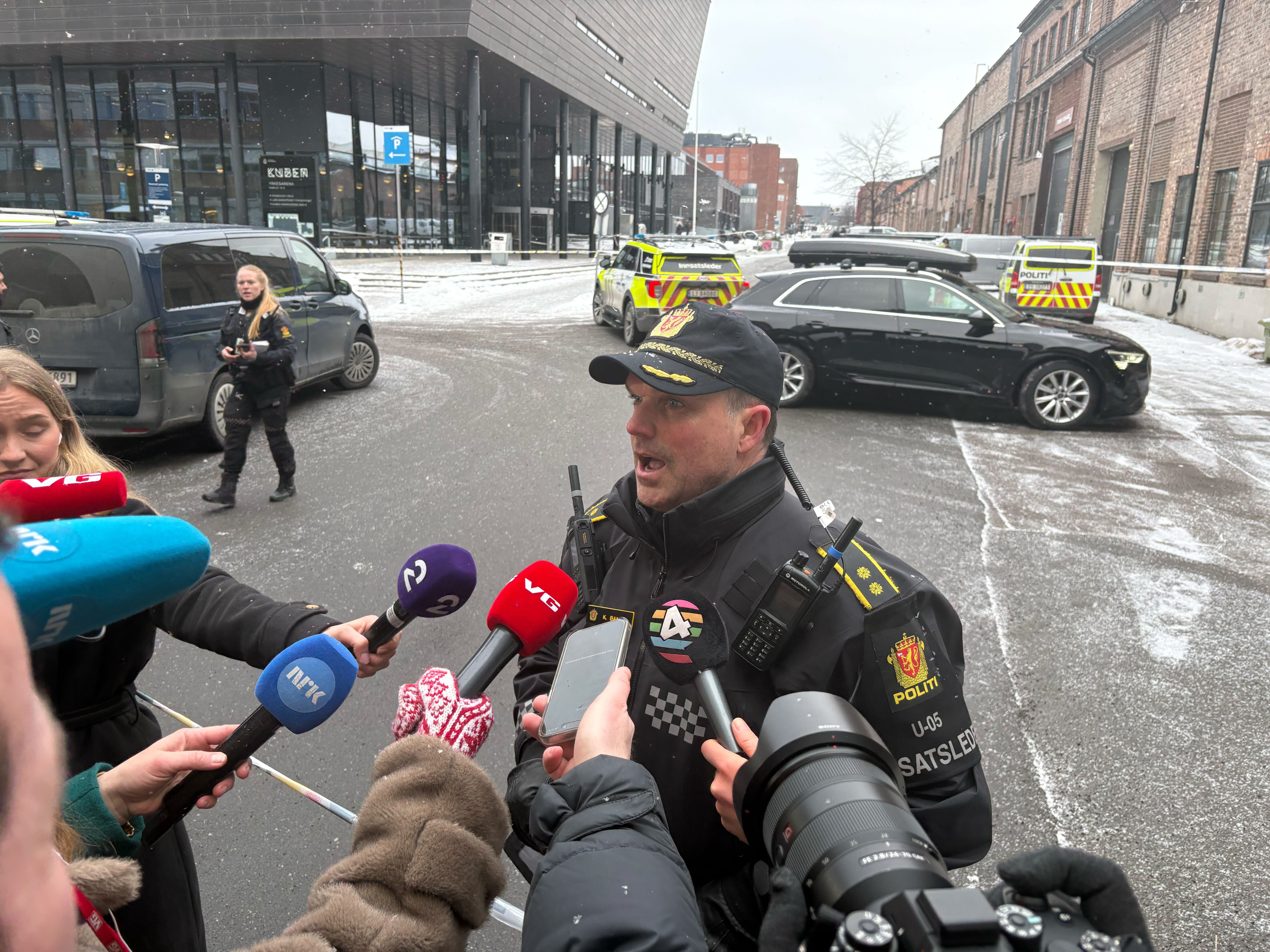 ALVORLIG: Innsatsleder Kristoffer Bang bekrefter at det ble avfyrt flere skudd utenfor Kuben videregående skole fredag ettermiddag.