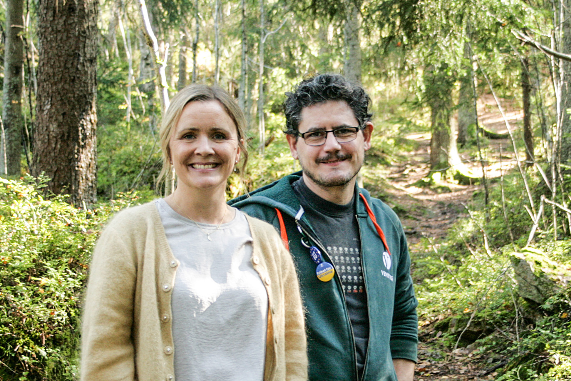 FLOTT SKOG SKAL BLI FLOTTERE: Marit Vea (V, t.v.) og Nicolás Alejandro Spirdal-Jacobsen Mendoza (V) er klare på at det nå kun skal tynnes for å øke artsmangfoldet i nærskogen til Haugerud. Enkelte områder der bærer i dag preg av lite artsmangfold, dominert av gran.