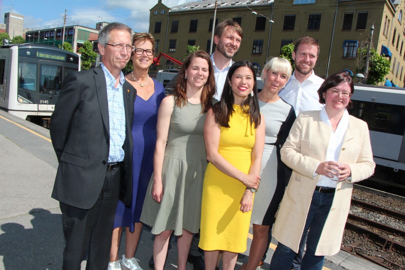 ENDELIG FERDIG: På overtid har Oslopakke 3-gruppa kommet fram til en ny revidert avtale. Nå er midlene til prosjekter i Groruddalen sikret, selv om det tar lang tid å komme i gang. Her står vegdirektør Terje Moe Gustavsen, jernbane-sjef Elisabeth Enger, Solveig Schytz (V), Eirik Lae Solberg (H), Lan Marie Nguyen Berg (MDG), Tonje Brenna (Ap), Andreas Halse (Ap), og fylkesordfører Anette Solli (H). Foto:Bilde 1 av 3