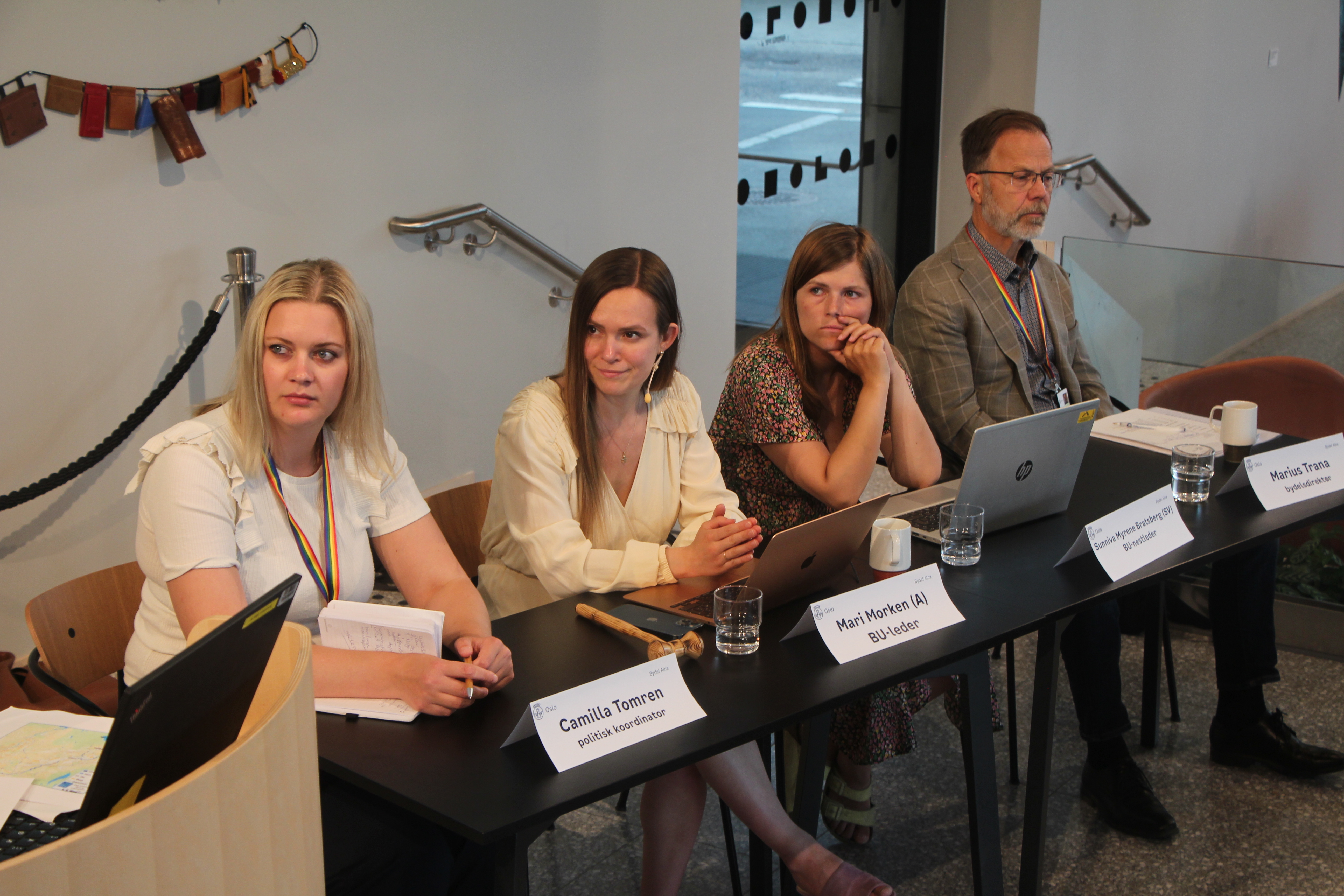 SISTE TØRN: Torsdagen var siste møte for det nåværende bydelsutvalget i Alna. Så blir det spennende å se hvem som sitter i leder- og nestlederstolene som Mari Morken (andre f.v.) og Sunniva Myrene Bratsberg (andre f.h) har hatt i fire år. FOTO: Sindre Veum ApnesethBilde 1 av 2