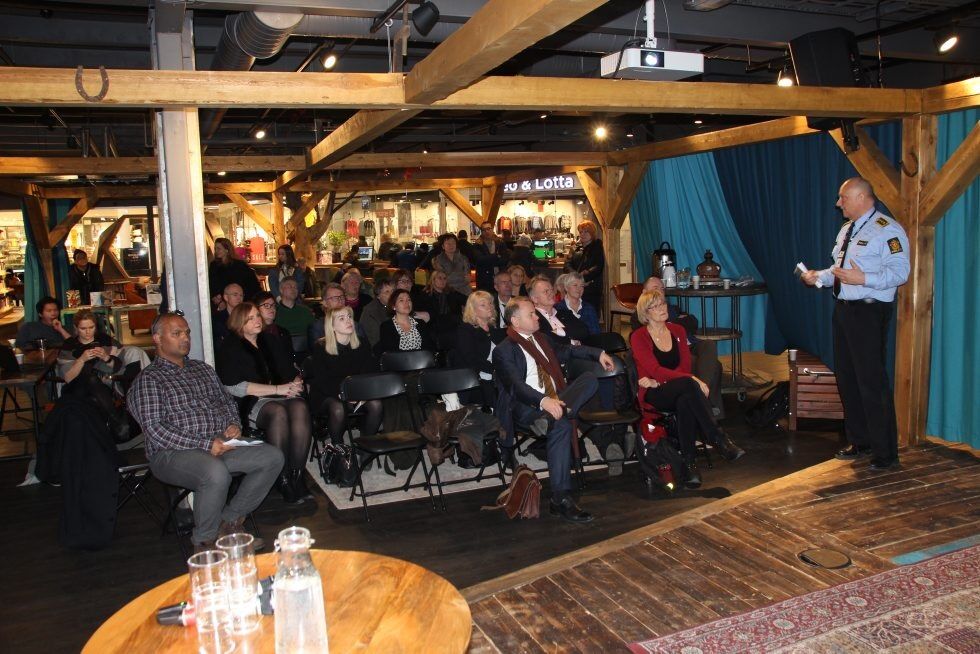 ÅPENT MØTE: Ett av stoppene på komitéreisen til Stortingets kommunal- og forvaltningskomité var Deichman Stovner. Alt fra levekårforskjeller til områdesatsing sto på dagsorden, og politisjef John Roger Lund fortalte litt om arbeidet mot ungdomskriminalitet. Foto:Bilde 1 av 3