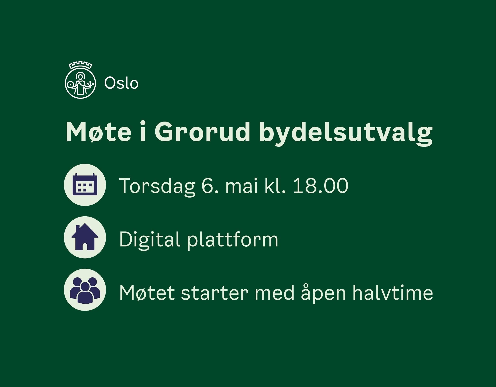 Dersom du vil holde innspill i åpen halvtime ber vi om at du melder deg på senest 6. mai klokka 12.00. Påmelding sendes til gry.sjodin.neander@bgr.oslo.kommune.no.