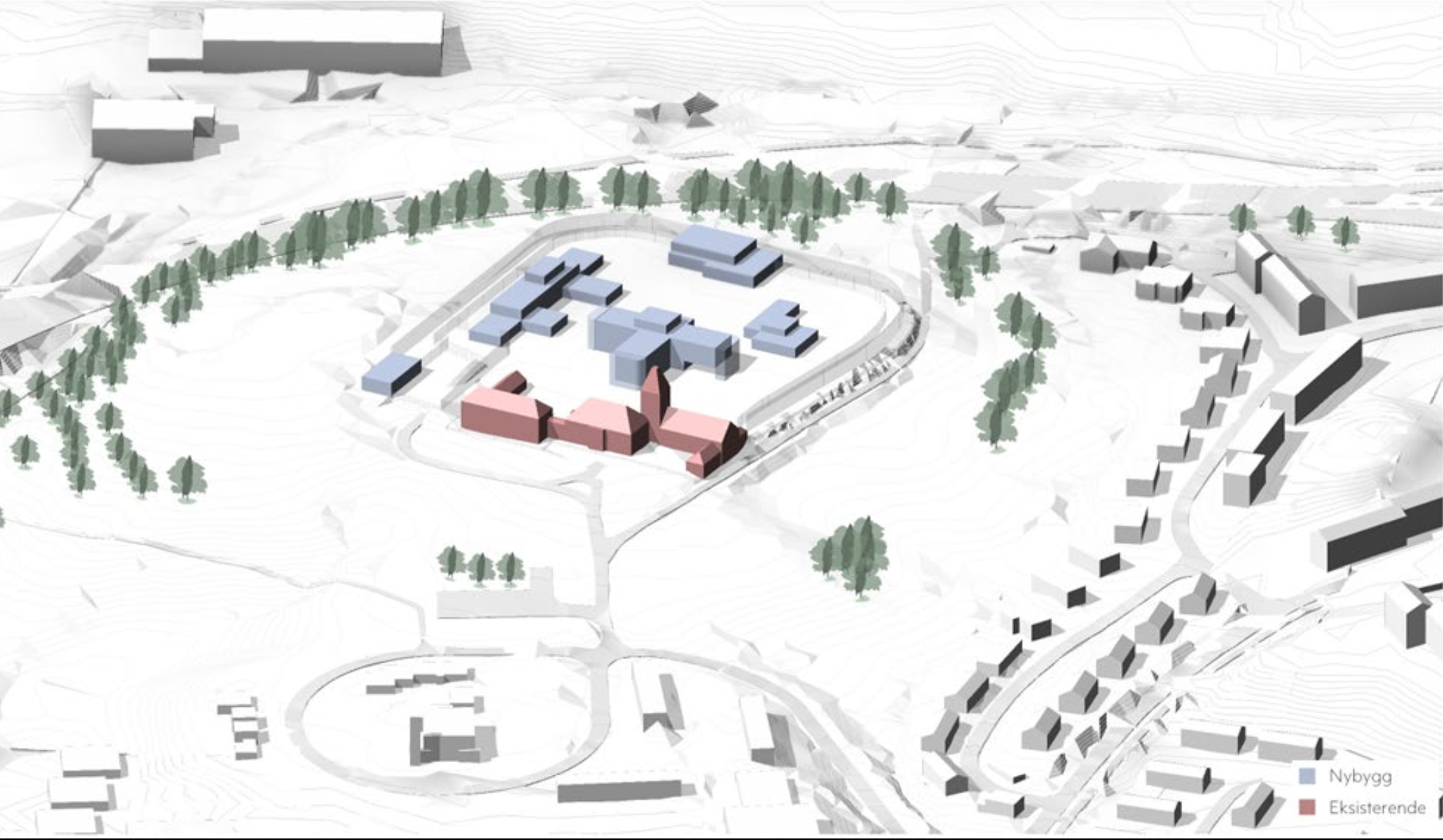 ETT AV TO ALTERNATIVER: Selv de nedskalerte fengselsplanene på Bredtvet er omfattende. Rødt er eksisterende bygningsmasse, blått er nytt. (Illustrasjon: Statsygg)Bilde 1 av 6