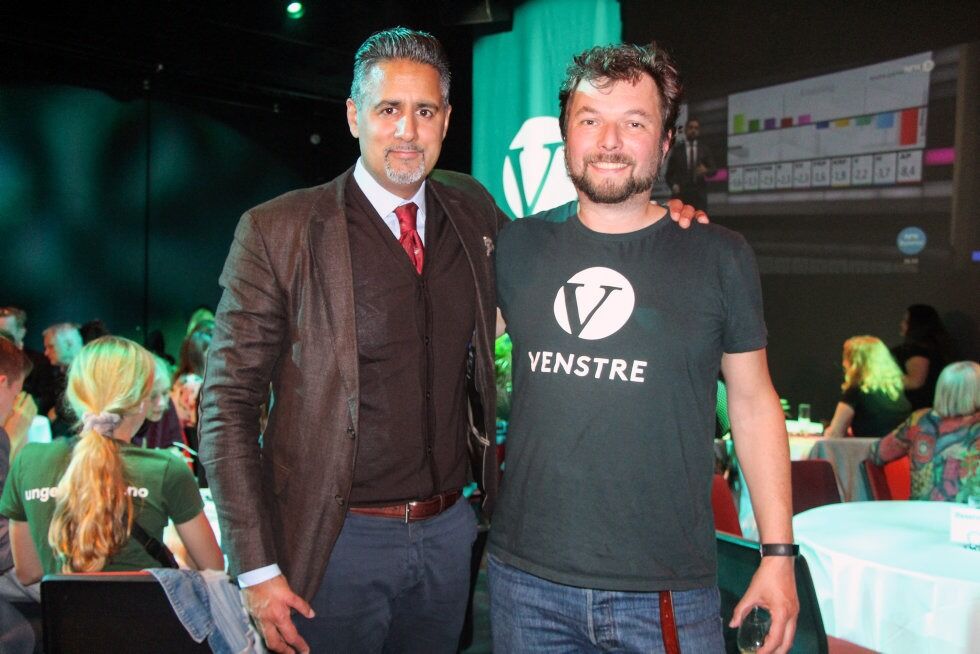 HAR KJEMPET SOM ET LAG: Da avisa besøkte Venstres valgvake midt under den første opptellinga var stemningen relativt god. Men både Abid Raja og Christian Herzog erkjenner at Venstres valgkamp til tider har vært kronglete. Foto:Bilde 1 av 1