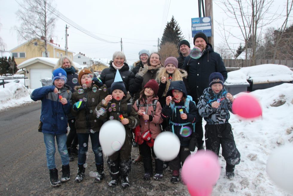 FEST I GATA: Store og små samlet seg i Hellerudveien for å feire den gode nyheten. Foran fra venstre: Emrik Paulsen Skaarud, Erling Solberg Ellingsæter, Fredrik Solberg Ellingsæter, Ragni Nygård Watne, Sofie Dalseg Ramskjell, Eivind Åkerholm. Bilde 1 av 1