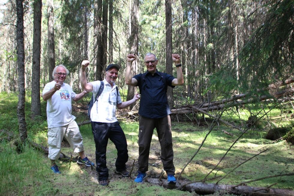 JUBLER FOR NATUREN: Ben Borgen, Rolv Norum og Frode O. Hansen han endelig puste lettet ut i viten om at vernearealet for Røverkollen nå utvides. Foto:Bilde 1 av 4
