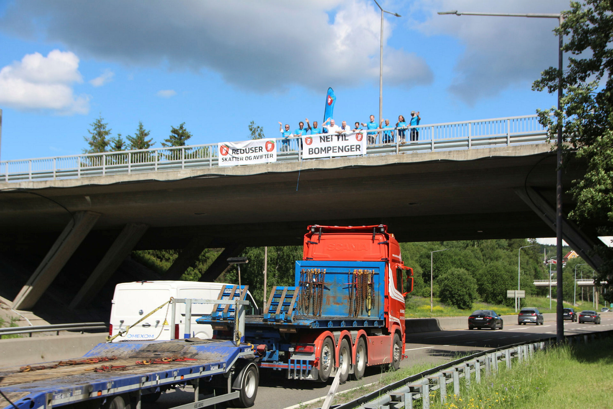 TUUUUT, TUT! Lyden av et trailerhorn runger over Haugenstua onsdag ettermiddag, tett fulgt av et lite kor med litt mindre voldsomme tutinger fra bilister på vei hjem fra jobb. Oppå brua over Østre Aker vei har nemlig Stovner Frp funnet fram banneret fra forrige valgkamp - med det krystallklare budskapet: «Nei til bompenger».