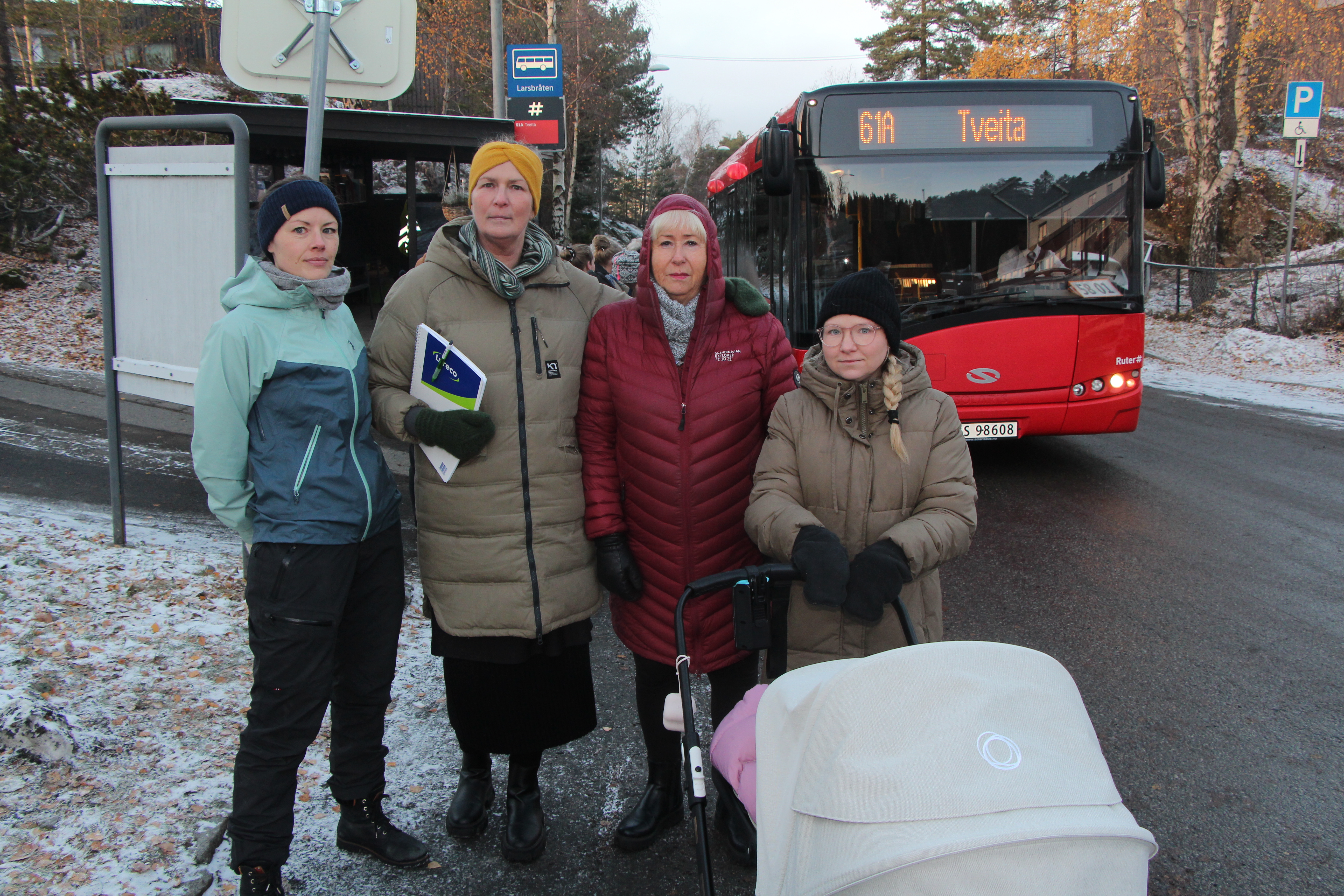 HAUGERUD: Naboene i Larsbråtveien vil beholde lokalbussen sin. Den er et viktig fremkomstmiddel for beboerne som trenger den til gjøremål som handling på butikken, kunne ta seg effektivt fram med hele familien, og knytter dem til resten av Ruters kollektivnett. Nå vil de forsøke å få Ruter til å snu i saken. Her med Erika Steinholt Mortensen, Anne Sørum Ekeberg, Solveig Th. Zagar og Thale Sande Stub. Bilde 1 av 2