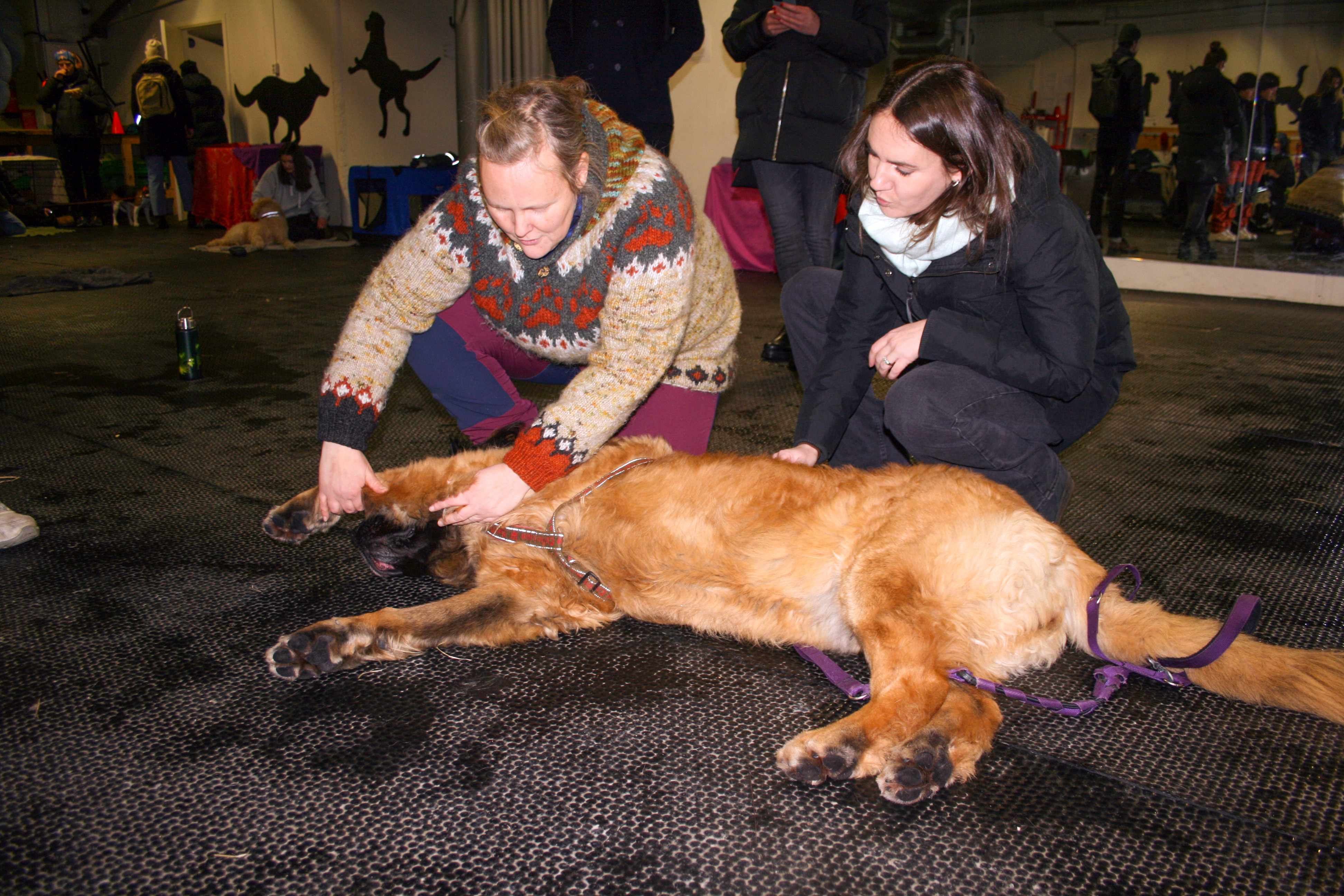 VIKTIG ALTERNATIV: Elevene på Natur videregående har en litt annerledes skolehverdag. Her er hundefysioterapeut Hilde Iren Austad Solberg (t.v.) i gang med å vise strekketeknikk til byråd Julie Remen Midtgarden (H).Bilde 1 av 2