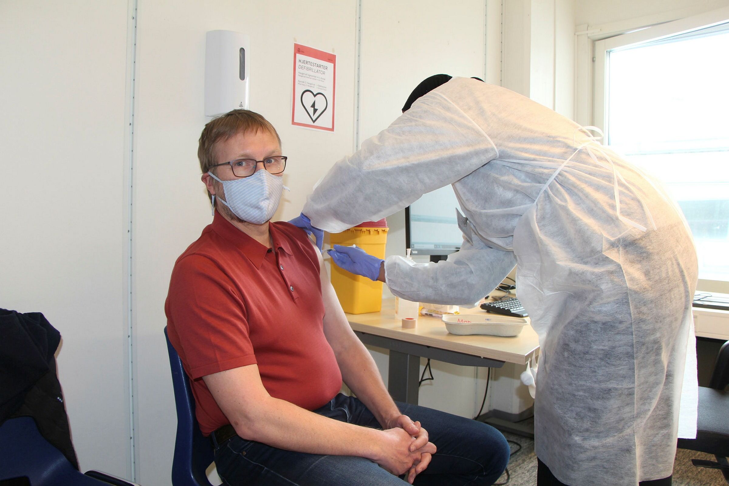 ETTERLENGTET: Moderna-vaksinen ble brukt da Rune Sørra fikk sin første vaksinedose på Haugerud mandag ettermiddag. I alt ble 260 vaksinert på mandag, men bydelen har en dagskapasitet på 600. Foto: Sindre Veum ApnesethBilde 1 av 3
