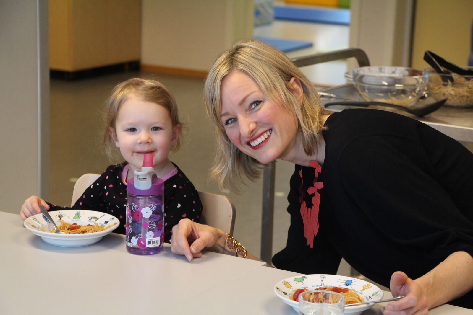 VENNER: Byråd for eldre-, helse og sosiale tjenester, Inga Marte Thorkildsen (SV), fikk spise sammen med Nicole (3) i Flaen barnehage. De ble fort gode venner, og byråden mener det er minst like viktig å vise omsorg for barna, som å ha fysisk aktivitet og godt kosthold. Foto:Bilde 1 av 2