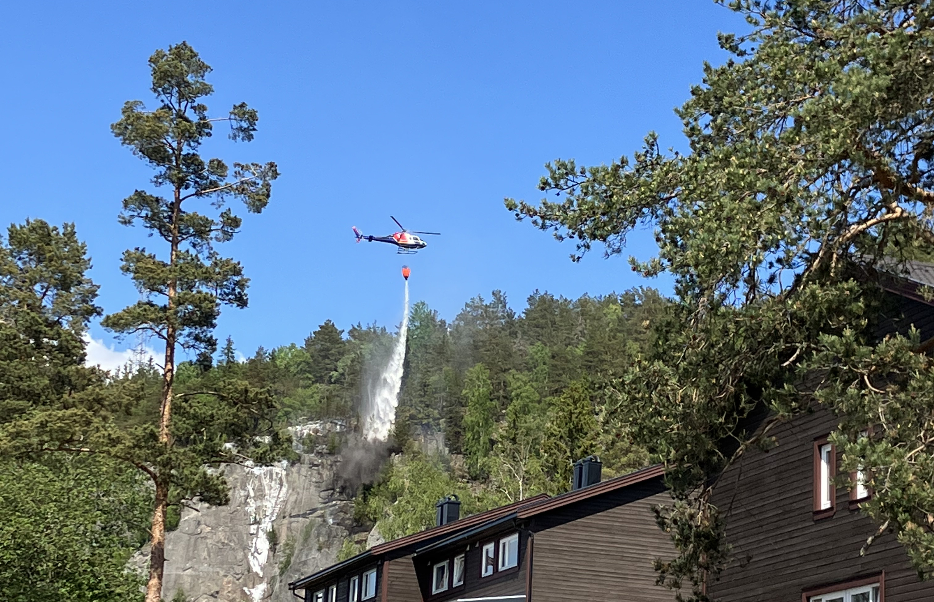Akkurat nå er det helikopter fra brannvesenet over stedet, og bakkemannskap har tatt seg inn fra Romsås-siden. Det er en kort spasertur, men ikke mulig å kjøre helt inn med bil.