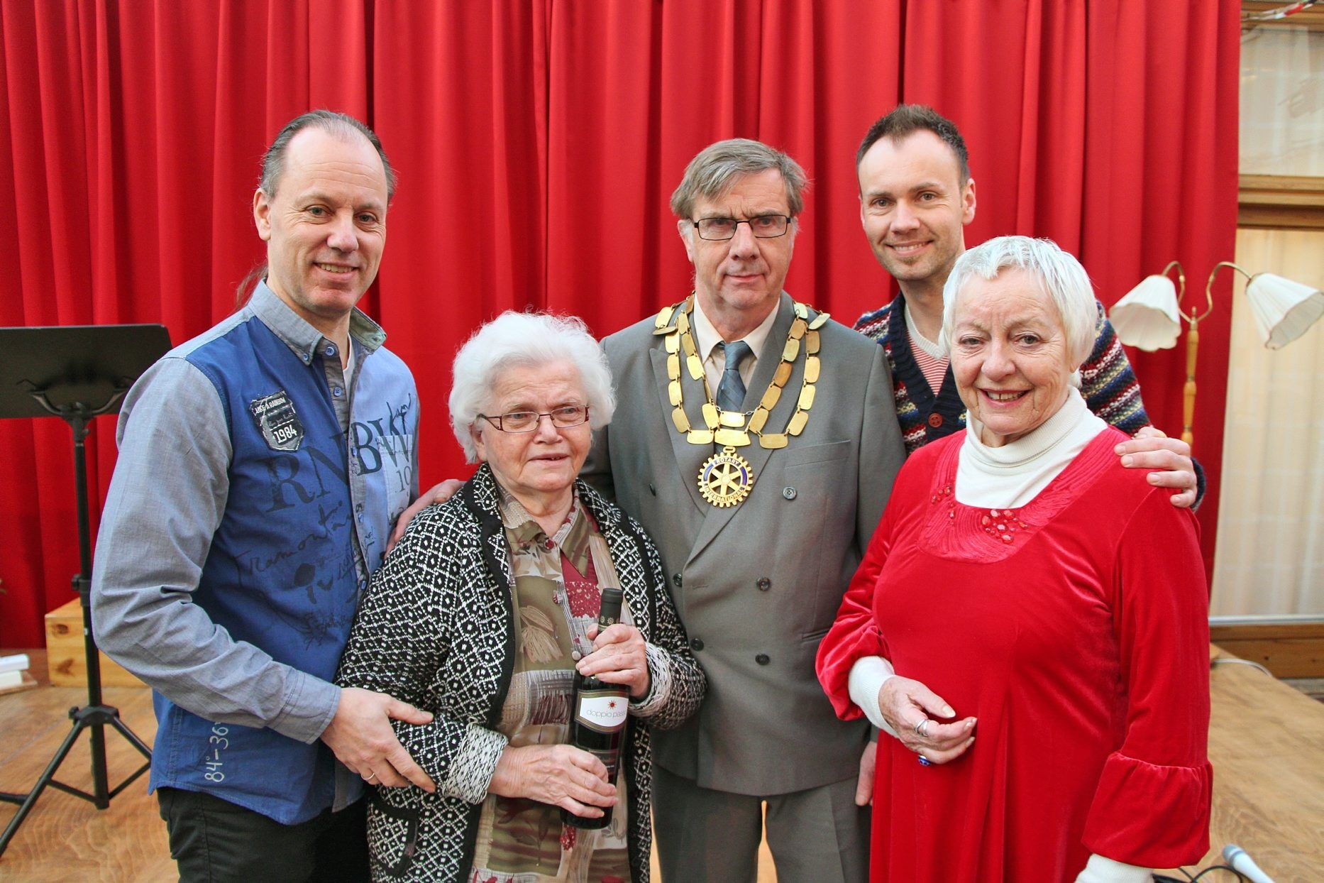 Nelly Bakken på Ammerudhjemmet er fornøyd med julegaven fra Grorud Rotary, nemlig en god rødvin til julemiddagen.