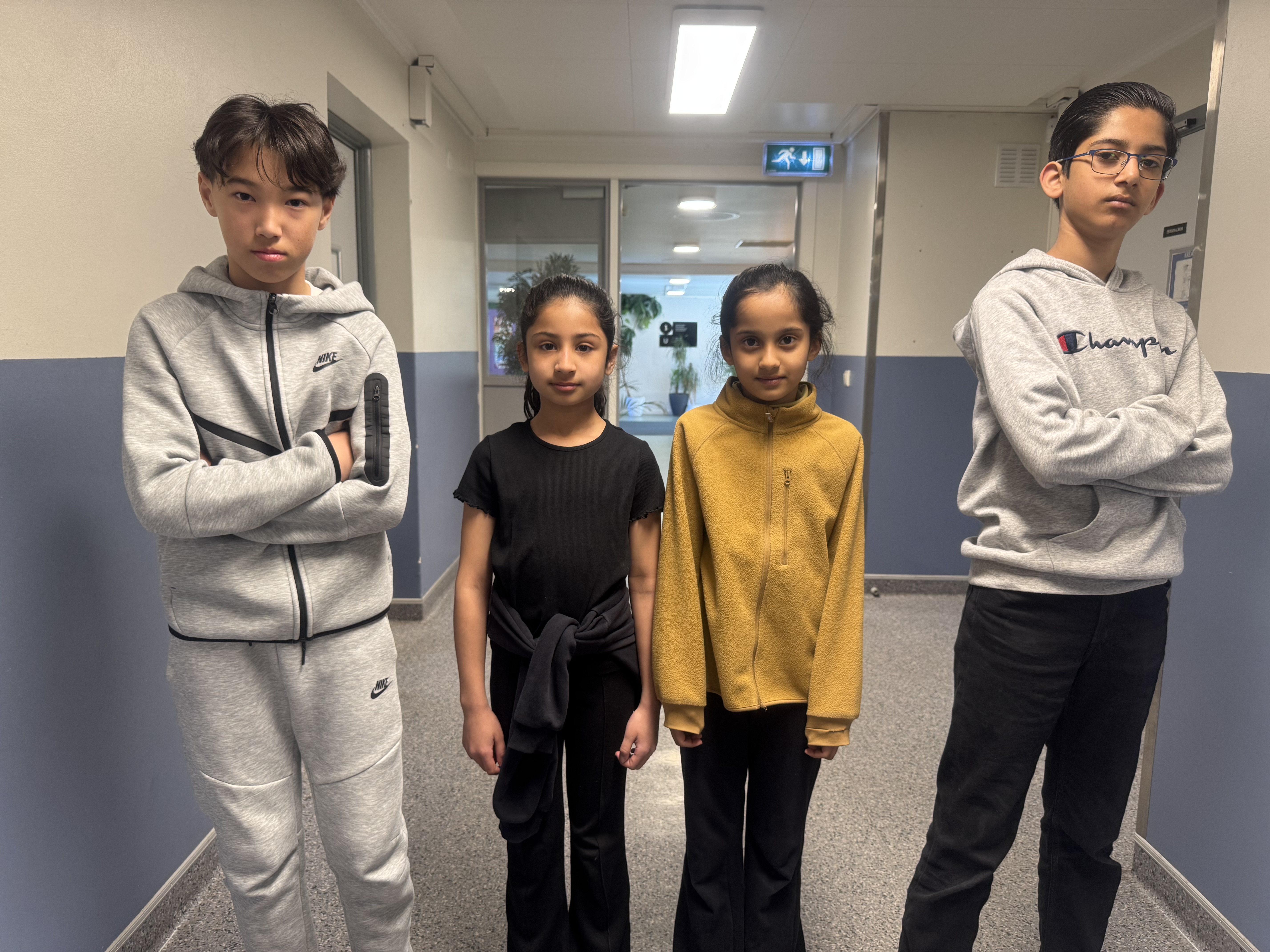 KLAR TALE: Yunos (6. klasse), Inaaya (4. klasse), Alaia (4. klasse) og Shahaan (7. klasse og nestleder i elevrådet) er lei av hærverk og forsøpling på Furuset skole. De forteller at det både gjør dem lei seg og påvirker skolemiljøet – og ber om at de som bruker området viser respekt og rydder opp etter seg.