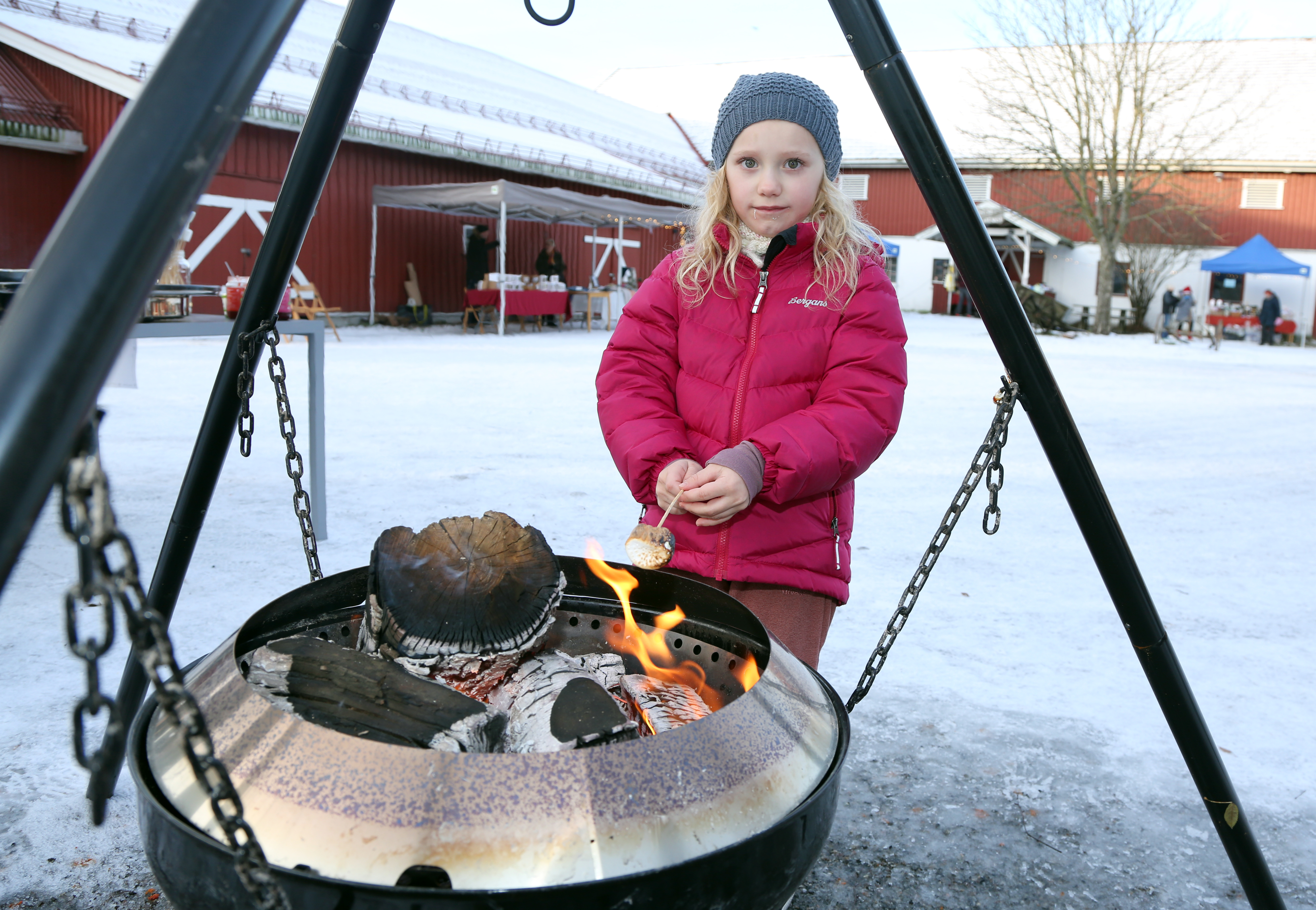 POPULÆRT SNADDER: Intet er som en god oppvarmet marshmallow på en kald desembersøndag på Nordtvet gård – og det sørget selvsagt Olivia for å få med seg. FOTO: Rolf E. Wulff