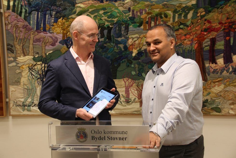 SER FREMOVER: BU-leder Rashid Nawaz (t.h.) mottar her et fremtidsrettet budsjett (passende nok levert på nettbrett) av bydelsdirektør Alv Sørland. Foto:Bilde 1 av 1