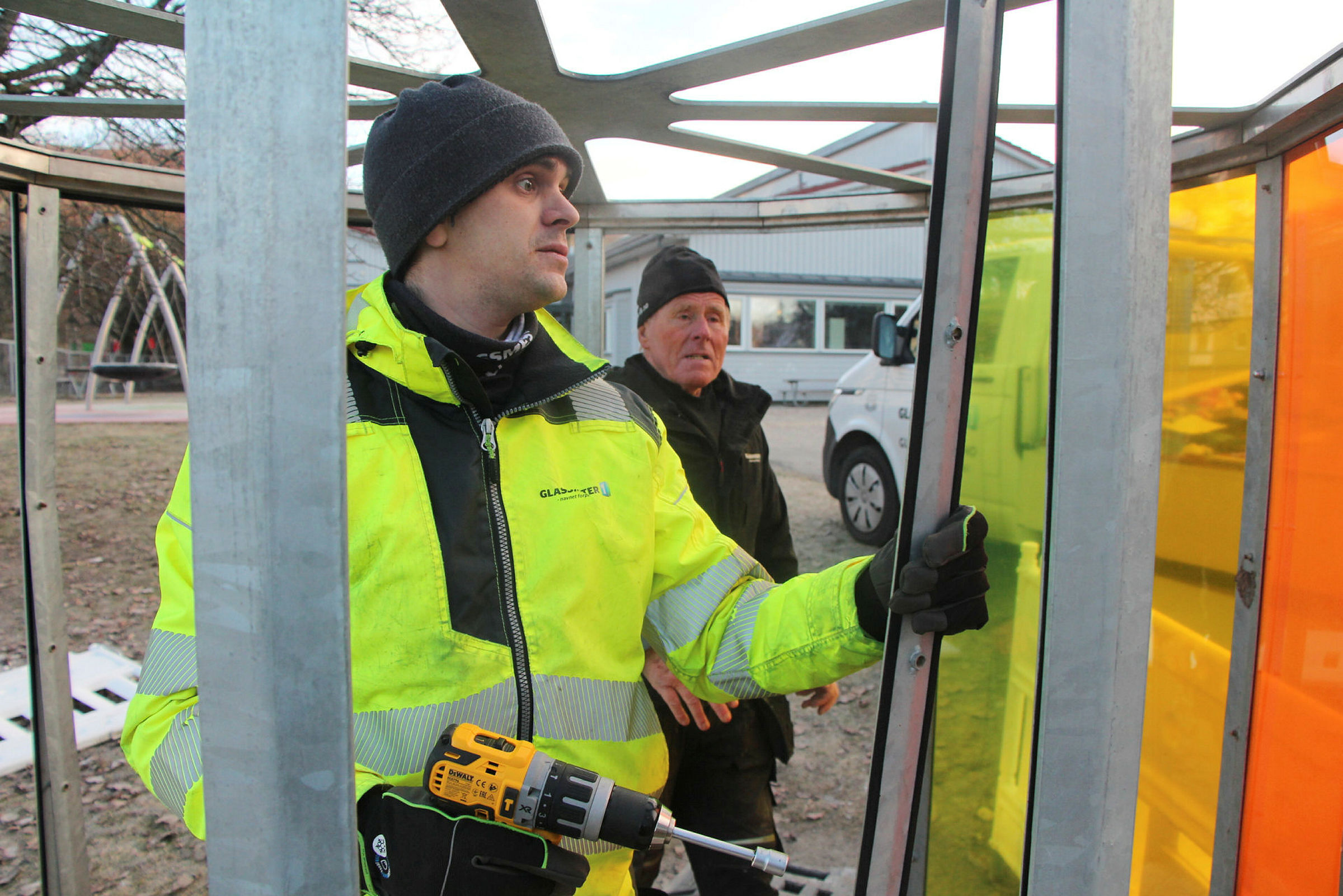 HAUGENSTUA BARNEHAGE: Barnehagen har to flotte kunstinstallasjoner. En inne og en ute. Spektrum, som kunsten utendørs heter, har til stadighet blitt utsatt for hærverk av pøbler. Tirsdag ble kunsten reparert, og nå håper barnehagestyreren at den får stå i fred. Her med Deividas Dambrauskas og Finn Eriksen fra Glassmester1. Foto: Sindre Veum ApnesethBilde 1 av 1