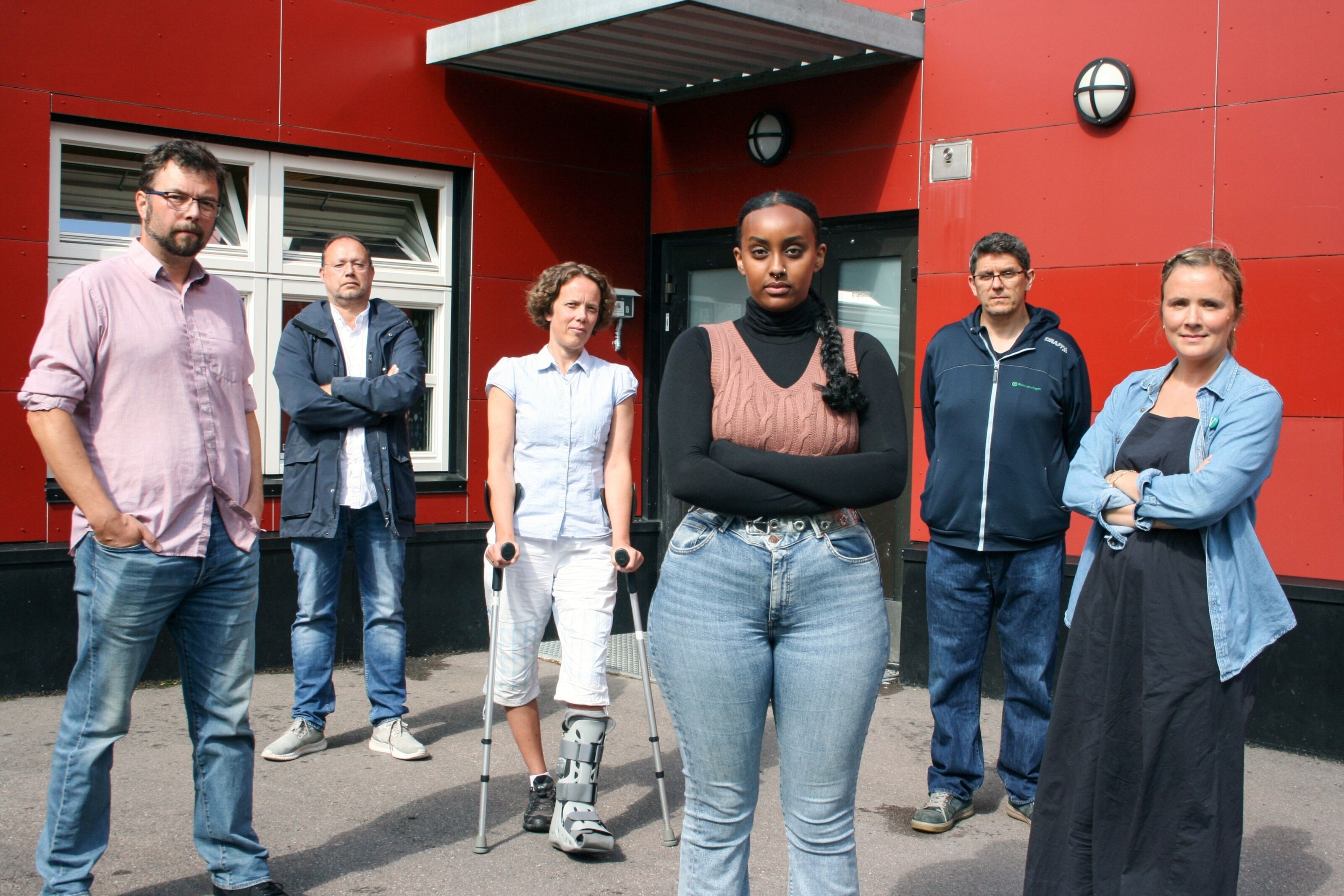 IKKE HOLDBART: Christian Herzog i Alna Venstre (f.v.), Alexander Nunes-Xavier i driftsstyret, Ellen Halsør i foreldregruppa, tidligere elevrådsleder Hiyab Fshaye, Damir Cokovic i FAU og Marit Kristine Vea i Bystyret (V) er ikke fornøyd med forslaget i Skolebehovsplanen. De mener at skolen i det minste må få ta i bruk de midlertidige lokalene som er satt opp. Foto:Bilde 1 av 2
