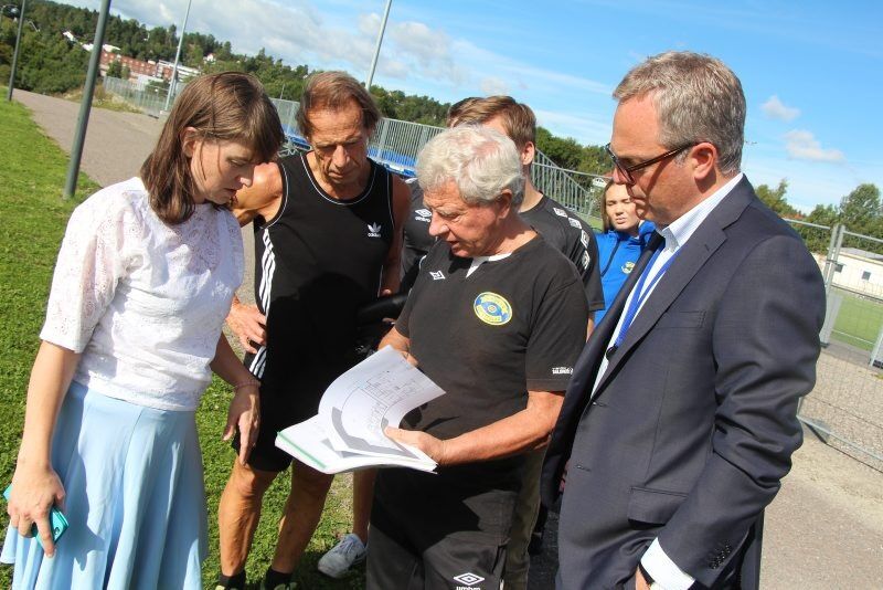 STORT ENGASJEMENT: En ny hall på Grorud har vært planlagt siden 80-tallet. Nå har idrettsbyråd Rina Mariann Hansen (Ap) funnet fram 1,5 millioner kroner til forprosjektering av Grorud flerbrukshus. Her sammen med Grorud-leder Richard Pedersen, Jan Bøhler (Ap), bydelsdirektør Øystein Eriksen Søreide og ansatte i Grorud IL. Foto:Bilde 1 av 1